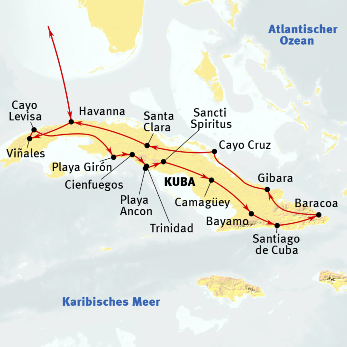 Havanna - Vinales - Cayo Levisa - Playa Giron - Cienfuegos - Trinidad - Playa Ancon - Sancti Spiritus - Camagüey - Bayamo - Santiago de Cuba - Baracoa - Gibara - Cayo Cruz - Santa Clara - Havanna