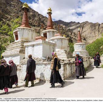 Ladakh begeistert mit grandioser Hochgebirgslandschaft sowie den typischen Klöstern und Gompas, die oft bizarr in Bergflanken gebaut sind. IKARUS TOURS war einer der Pioniere in Ladakh, das seit 1974 für ausländische Besucher zugänglich ist. Eine Reise in diese Region gilt als eines der unvergesslichsten Erlebnisse im Reiseleben. Die Geschichte Ladakhs ist eng mit der Tibets verknüpft, und prägt die Kultur der gesamten Himalaya-Region. Der tibetische Buddhismus ist hier lebendig, sichtbar in den zahlreichen bewirtschafteten Klöstern. Nur in diesen Hochtälern an der chinesisch-tibetischen Grenze blieb der tibetische Buddhismus bis heute erhalten. Zudem ist das beeindruckende Nubra-Gebiet seit 1994 für ausländische Gäste zugänglich.
