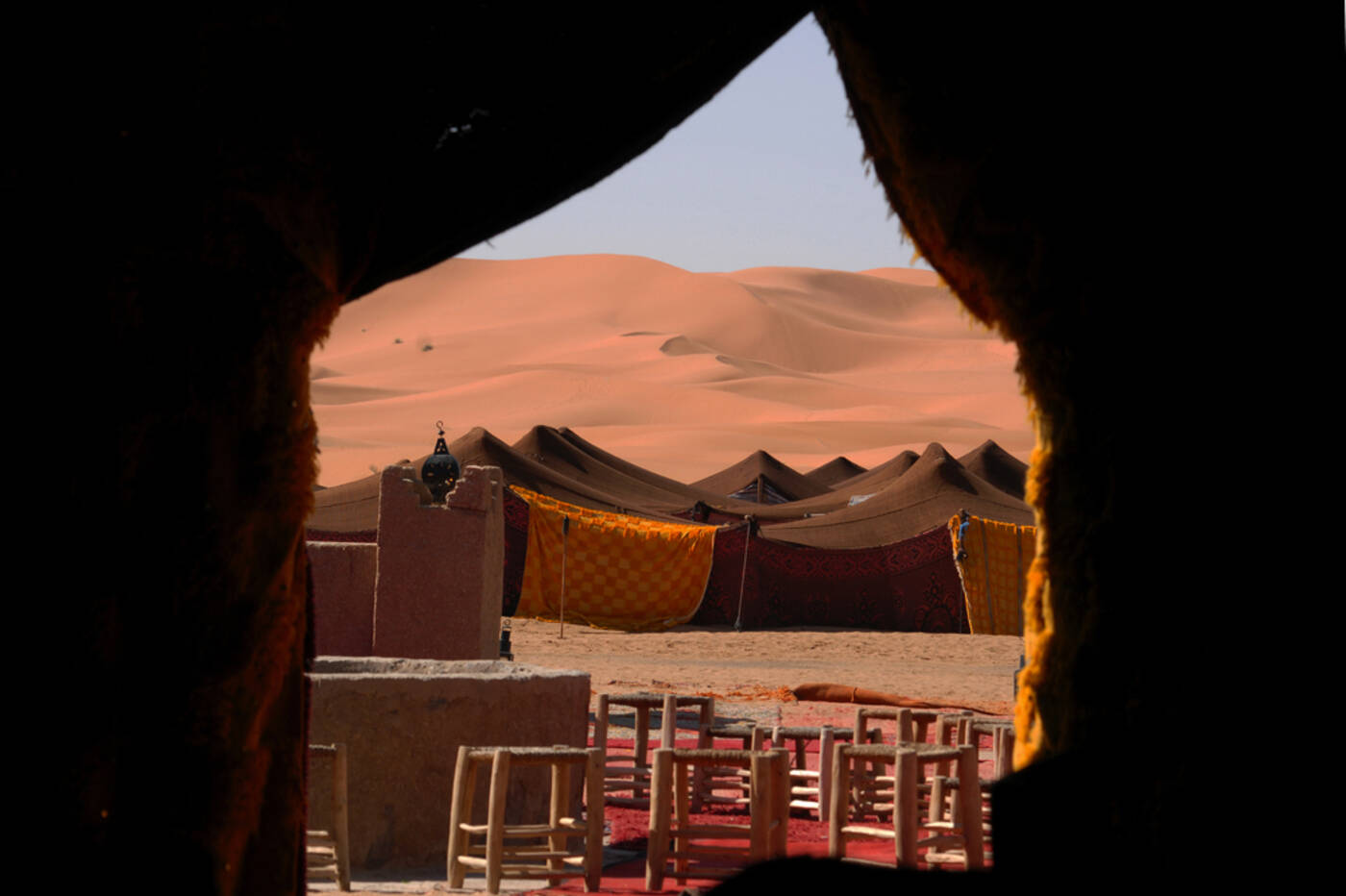 Morgens kurzer Besuch der früheren Karawanenstadt Rissani, dann geht es nach Merzouga, wo wir in Jeeps umsteigen, um zu unserem Wüstencamp zu fahren. Nachmittags Zeit, um die Ausläufer der Wüste des Erg Chebbi, ein schönes Dünengebiet, zu Fuß oder per Kamel zu erkunden. Wir übernachten in Beduinenzelten (mit Betten) in einem feststehenden Nomadencamp. Die Bäder teilen wir mit anderen Gästen. Abendessen mit lokalen Gerichten und traditioneller Gnaoua Live-Musik.