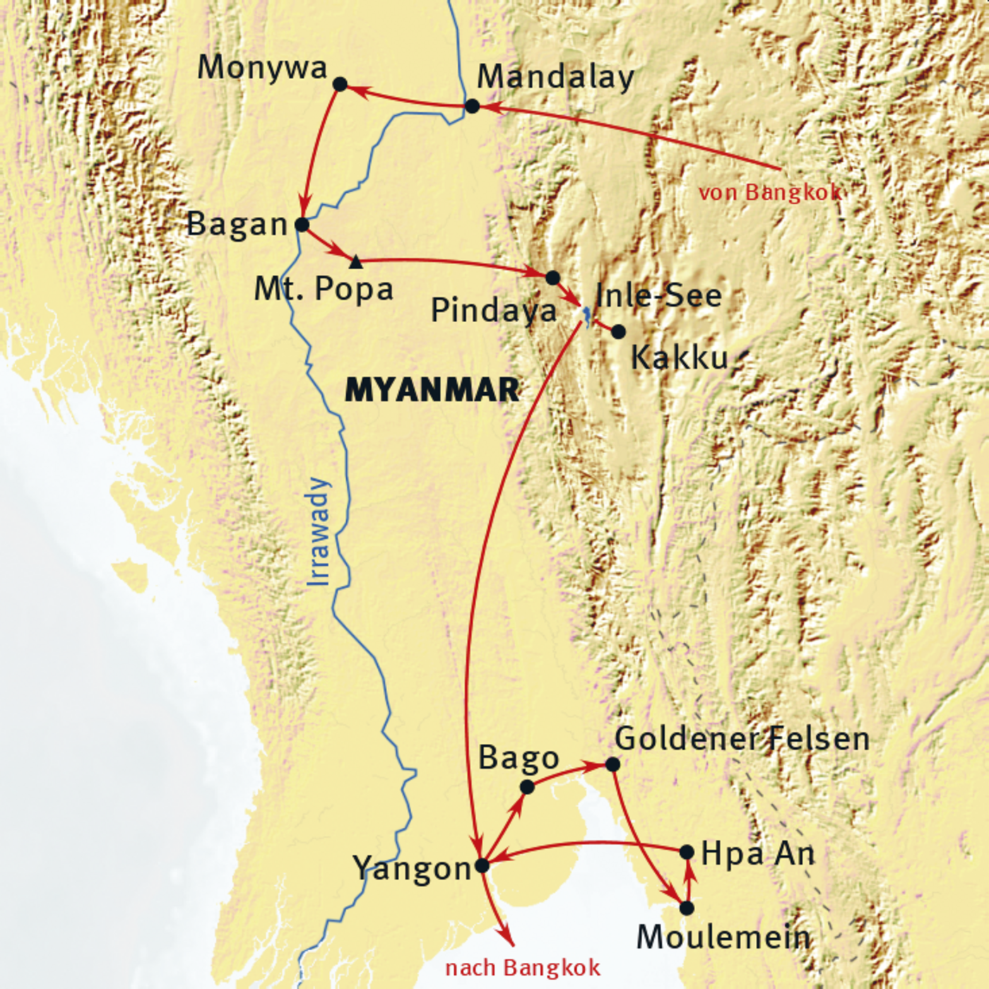 Myanmar, früher Burma, ist das ursprünglichste Land Südostasiens. An der Schnittstelle zwischen Indien, China und Thailand hat das Land zahlreiche kulturelle Einflüsse erfahren. Die jahrzehntelange Isolation bewahrt das "alte Asien" mit einer einzigartigen Landschaft und Kultur. Myanmar bietet eine faszinierende buddhistische Kultur, koloniales Erbe und eine ethnische Vielfalt. Bei dieser umfassenden Reise von Nord nach Süd wollen wir den kulturellen und geografischen Reichtum des Landes erkunden, ganz ohne Hektik. Wir besuchen die alte Königsstadt Mandalay, die Tempel von Bagan und die Region um den Inle-See sowie die Metropole Yangon. Auch weniger bekannte Ziele wie Monywa, die Shan-Kultur und der Goldene Felsen werden entdeckt. Eine anschließende Badeverlängerung am Ngapali-Strand rundet die Reise ab.