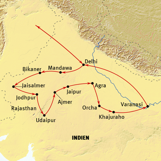 Rajasthan verkörpert das romantische, das märchenhafte Indien schlechthin. Hier befinden sich einige der großartigsten Sehenswürdigkeiten dieses riesigen Landes. Ehemals herrschten die Rajputen, die Maharajas, über große Reichtümer. Ihre Paläste und Forts, viele davon heute als Hotels genutzt, zeugen von dieser glanzvollen Vergangenheit. Unsere Reise führt uns zu den Höhepunkten Rajasthans, von der Tharr-Wüste mit der einzigartigen Stadt Jaisalmer bis zum Taj Mahal in Agra, einem der neuen sieben Weltwunder. Wir erleben Indien intensiv auf dem Landweg mit nur zwei Inlandsflügen, um Khajuraho und Varanasi zu erkunden. Eine Reise nach Rajasthan spricht tatsächlich alle Sinne an und weckt den Wunsch nach weiteren Abenteuern in diesem bunten und vielfältigen Land.