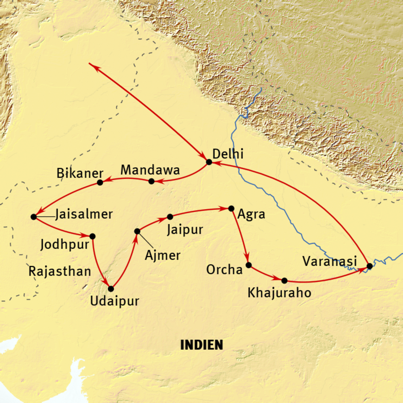 Delhi - Mandawa - Bikaner - Khimsar - Jaisalmer - Jodhpur - Ranakpur - Udaipur - Ajmer - Pushkar - Jaipur - Amber - Agra - Orcha - Khajuraho - Varanasi - Delhi