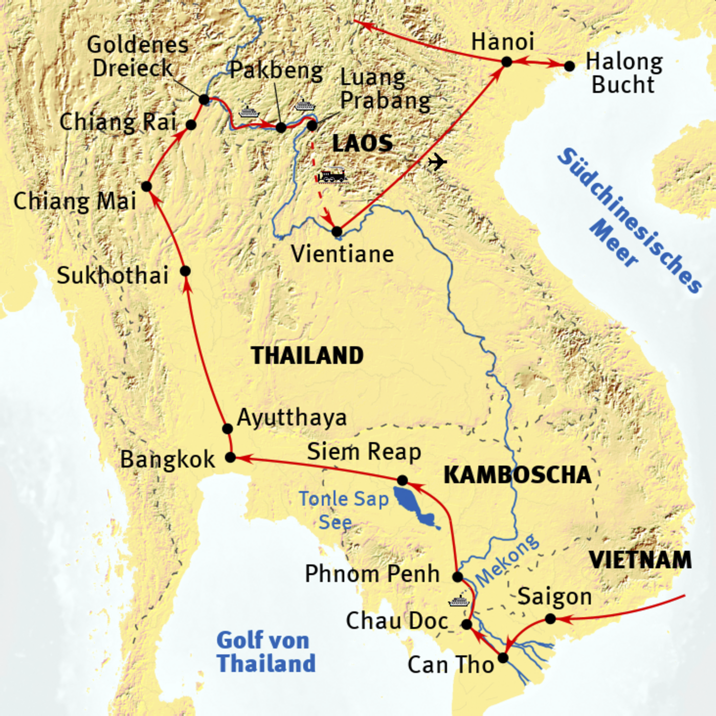 Saigon - Can Tho - Chau Doc - Phnom Penh - Siem Reap - Bangkok - Ayutthaya - Sukhothai - Chiang Mai - Chiang Rai - Pakbeng - Luang Prabang - Vientiane - Hanoi - Halong Bucht