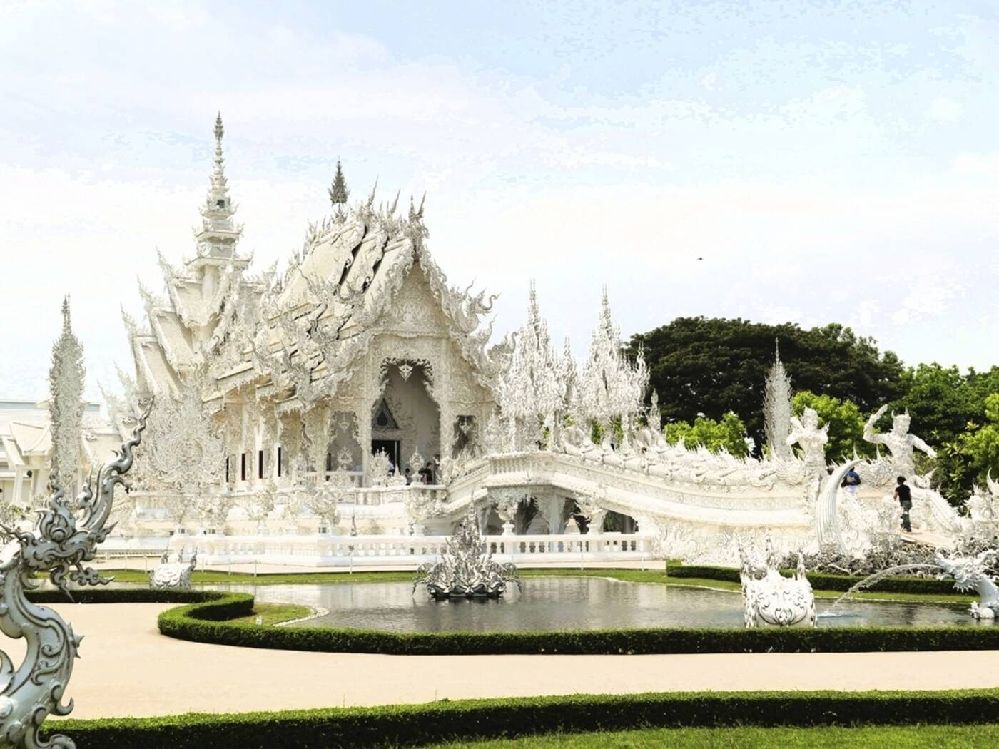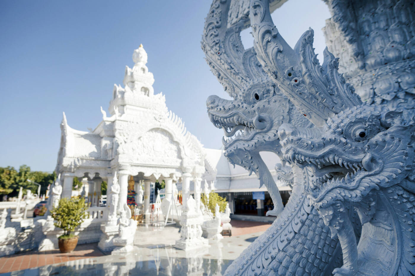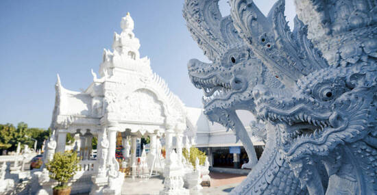 Heute verlassen wir Chiang Mai und fahren durch die fruchtbare, hügelige Landschaft Nordthailands in Richtung Chiang Rai – der nördlichsten Provinz des Landes. Unterwegs passieren wir kleine Dörfer, Teeplantagen und heiße Quellen, die von der vulkanischen Aktivität der Region zeugen. Etwas außerhalb von Chiang Rai erwartet uns eines der ungewöhnlichsten Bauwerke Thailands: der strahlend weiße Wat Rong Khun, ein moderner Tempelbau, der mit seinen kunstvollen Verzierungen und Spiegelmosaiken sowohl spirituell als auch architektonisch beeindruckt. Nicht weit entfernt besuchen wir den vom selben Künstler entworfenen Wat Rong Suea Ten – auch „Blauer Tempel“ genannt – dessen intensive Blautöne und fein gearbeitete Details ihn zu einem echten Blickfang machen. Zum Tagesausklang fahren wir weiter an den mächtigen Mekong, wo wir unsere Unterkunft direkt am Fluss beziehen – mit Ausblick auf das gegenüberliegende, nächtlich beleuchtete Laos. (320 km)
