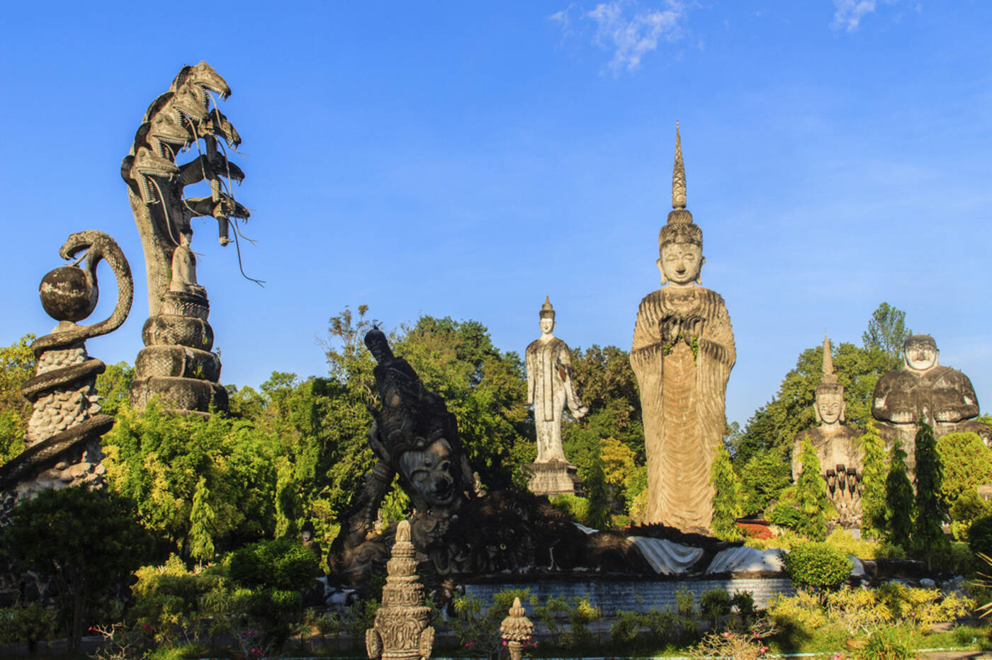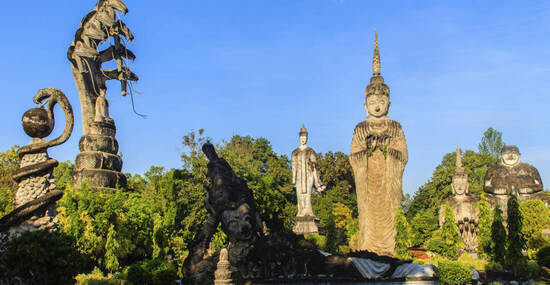 Heute fahren wir weiter entlang des mächtigen Mekong, der hier die natürliche Grenze zu Laos bildet. Immer wieder bieten sich herrliche Ausblicke auf das Flusstal – wir halten für Fotostopps, besuchen versteckte Tempel und spazieren durch kleine Dörfer, in denen das ländliche Leben spürbar wird. Bei Nongkhai, der wichtigsten Grenzstadt der Region, wurde 1994 die erste Brücke über den Mekong eröffnet. Sie ermöglichte erstmals eine direkte Landverbindung zwischen Thailand und dem zuvor isolierten Laos – ein Einschnitt, der auch das beschauliche Nongkhai langsam veränderte. Wir besuchen den lebhaften Indochina-Markt, auf dem Waren aus Laos, China und Vietnam angeboten werden – eine bunte Mischung aus Stoffen, Gewürzen, Tees und Haushaltswaren. Danach erwartet uns mit dem Wat Khaek ein wahrhaft ungewöhnlicher Tempel: In einer weitläufigen Parkanlage stehen teils riesige Skulpturen von Göttern, Dämonen und Fabelwesen aus unterschiedlichen asiatischen Mythologien – geschaffen von einem visionären Mönch, der Religion und Kunst auf seine eigene Weise verband.