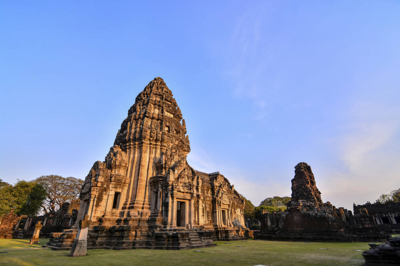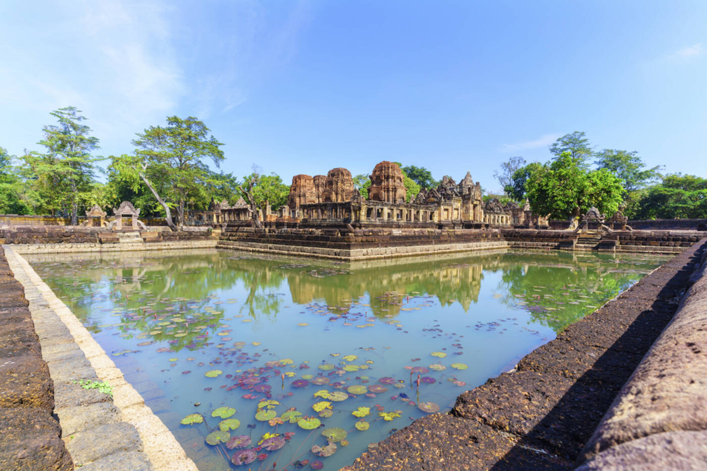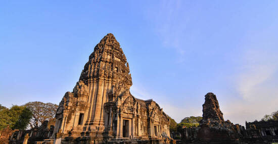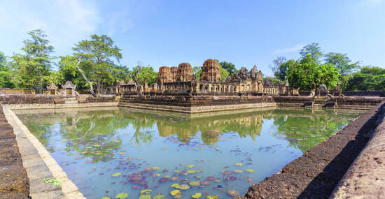 Noch vor Sonnenaufgang brechen wir auf, um zur Tempelanlage Phanom Rung zu fahren, einem der eindrucksvollsten Khmer-Bauten außerhalb Kambodschas. Erhaben auf einem Hügel gelegen – einst der Rand eines erloschenen Vulkankraters – thront der aus der Vor-Angkor-Periode stammende Tempel über der umgebenden Hügellandschaft nahe der kambodschanischen Grenze. Eine lange, steinerne Prozessionsallee, flankiert von Naga-Schlangen, führt hinauf zum Heiligtum, das mit fein gemeisselten Reliefs aus der hinduistischen Mythologie geschmückt ist. Der Sonnenaufgang taucht die Anlage in ein besonderes Licht – ein Moment, der in Erinnerung bleibt. Im Anschluss besuchen wir die kleinere, aber nicht weniger kunstvolle Tempelanlage Muang Tham, die mit liebevoll gearbeiteten Stürzen und Friesen beeindruckt. Malerische Seerosenteiche umrahmen die Anlage und verleihen ihr eine ruhige, fast meditative Atmosphäre.