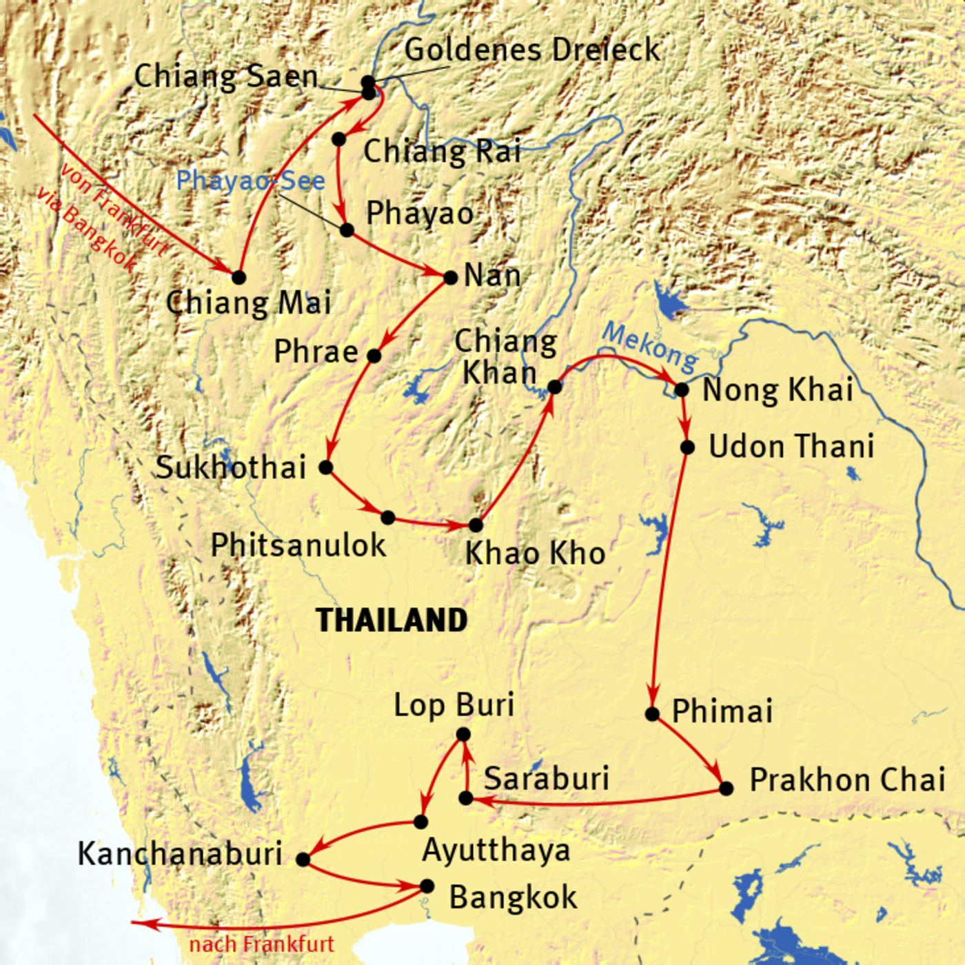Chiang Mai - Chiang Saen (Goldenes Dreieck) - Chiang Rai - Nan - Sukhothai - Chiang Khan - Udon Thani - Prakhon Chai - Ayutthaya - Kanchanaburi - Bangkok