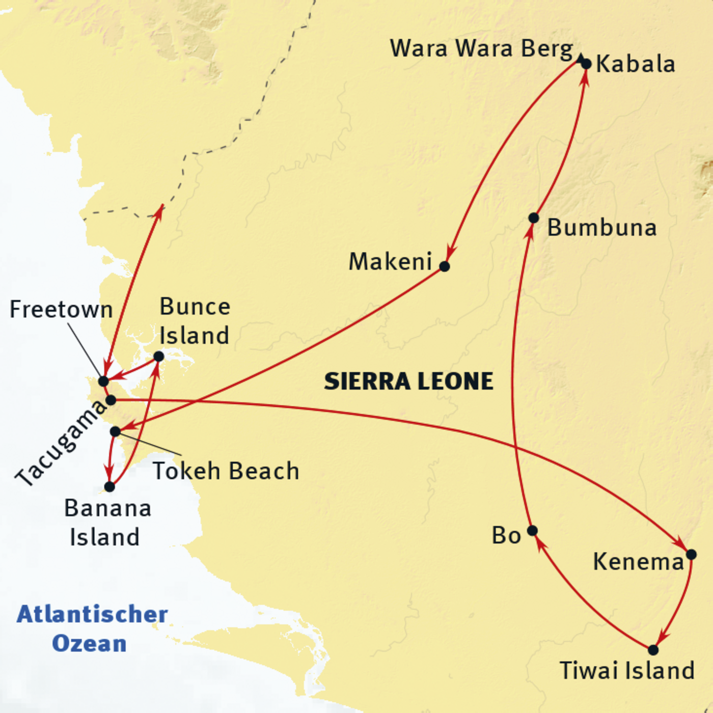 Conakry – Mamou – Dalaba – Mamou – Faranah – Kissidougou – Nzérékoré – Gbarnga (Liberia) – Monrovia – Tiwai Island (Sierra Leone) – Kenema – Bo – Freetown