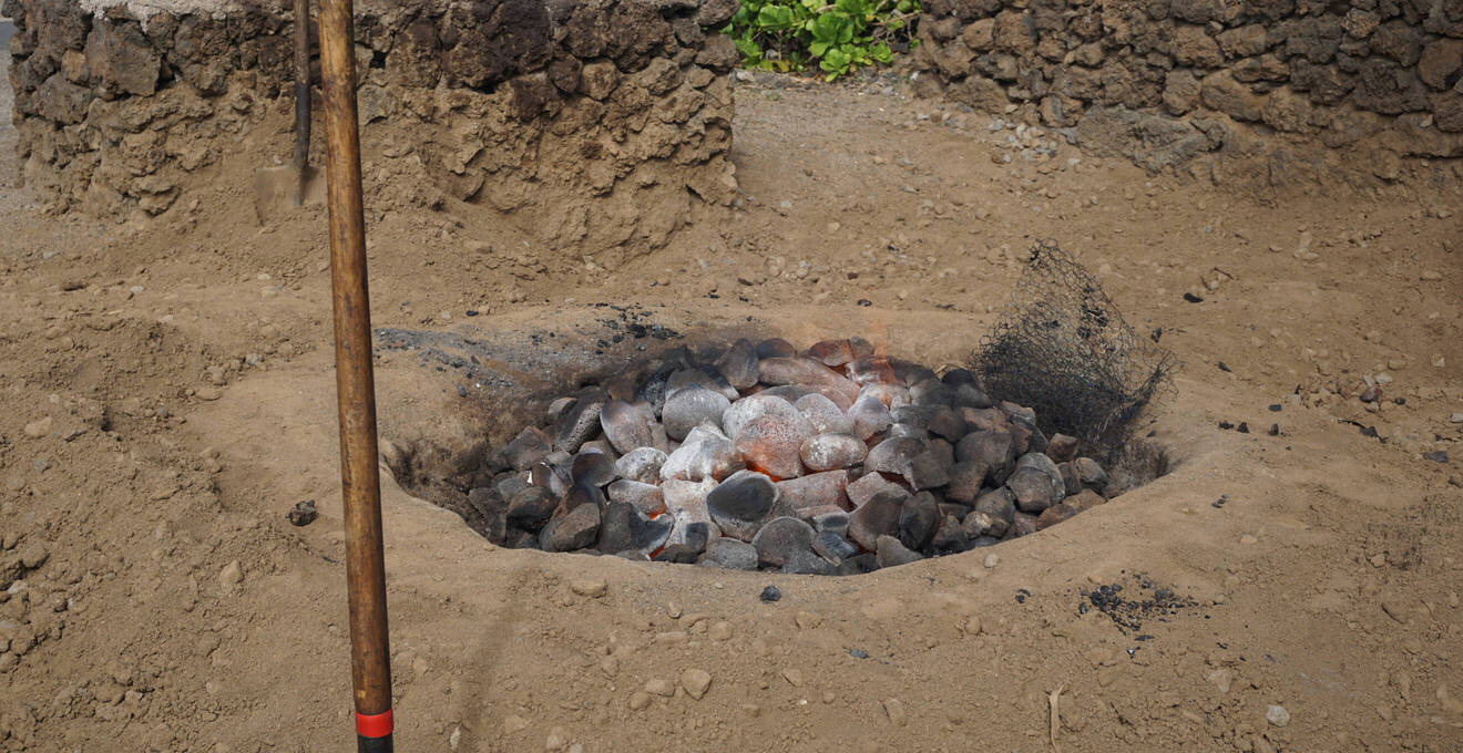 Zur Abwechslung werden alle Gäste dazu aufgefordert, zuzusehen, wie das Schwein aus dem Erdofen, dem Imu, geholt wird. Die erhitzten Lavasteine wurden schon entfernt. Nun wird mit Spaten in der feinsandigen Erde gebuddelt. Dabei kommt ein weißes Tuch zum Vorschein. Die beiden Männer entfernen es, und siehe da, es gibt ein neues Tuch. So geht es weiter, bis insgesamt fünf teilweise angesengte Tücher entfernt sind. Jetzt ist es fast geschafft, denn durch die Bananenblätter, welche die letzte Hülle bilden, sieht man nun das Tier. Es liegt auf einem großen Drahtgitter.