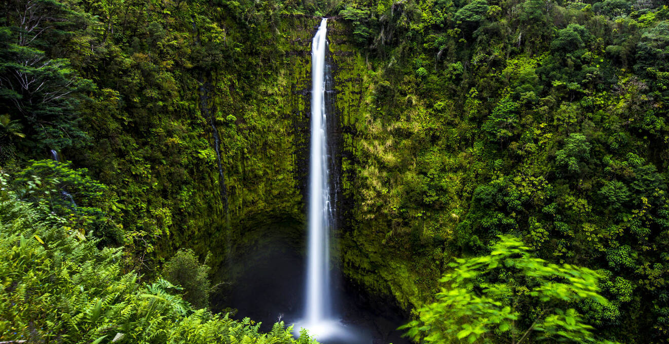 Nächster Halt ist bei den Akaka Falls. Außer uns kommen jedes Jahr ca. 200.000 Besucher hierher, um den höchsten senkrecht fallenden Wasserfall von Hawai’i zu bewundern. Auf einem Rundweg durch den Regenwald gelangen wir zu dem Aussichtspunkt, von dem aus man den 135 m hohen Wasserfall besonders gut sehen kann. Der Weg begeistert mich, denn die grüne Kulisse mit den vielfältigen Bäumen ist unbeschreiblich schön.