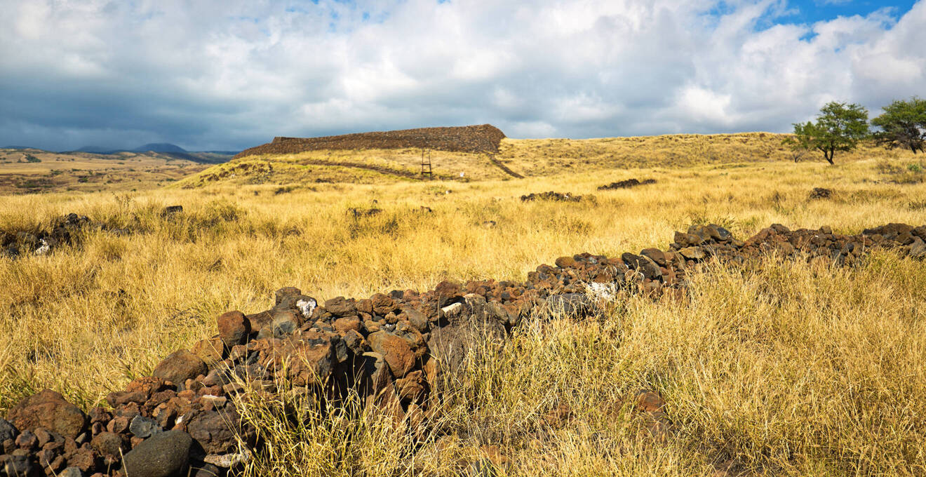 Heute geht es auf schnurgerader Straße durch ein Lavagebiet nach Norden. Wir erreichen die Pu’ukohola Heiau National Historic Site. Hier befindet sich der berühmteste Tempel der hawaiianischen Inseln. In dem kleinen Visitor Center kann man sich auf Schautafeln über Details zu diesem Tempel informieren. Infos über König Kamehameha I gibt es auch. Wir gehen eine Weile auf einem von dürrem Gras flankierten Weg bis uns ein windschiefer Zaun aus dünnen Hölzern den Weg, versperrt.