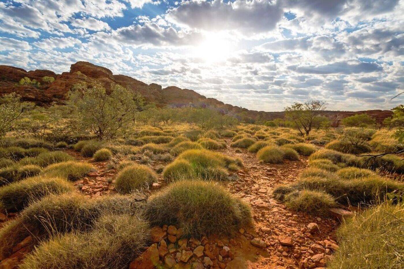 Die Fahrt durch die Weite des Roten Zentrums bietet unvergessliche Ansichten der fast menschenleeren Wildnis. Im Watarrka-Nationalpark wartet eine betörende Wüstenschönheit auf uns: Die im Abendlicht leuchtend rote Felskulisse des Kings Canyon imponiert mit um die 100 m hohen, zerklüfteten Steilwänden. Wo Wurzeln noch Wasser finden, begrünt überraschend üppige Vegetation die grandiose Szenerie.