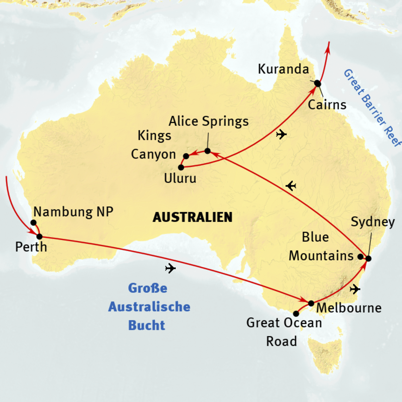 Perth - Fremantle - Nambung Nationalpark - Melbourne - Great Ocean Road - Sydney - Blue Mountains - Alice Springs - Kings Canyon - Uluru (Ayers Rock) - Cairns - Great Barrier Reef - Kuranda