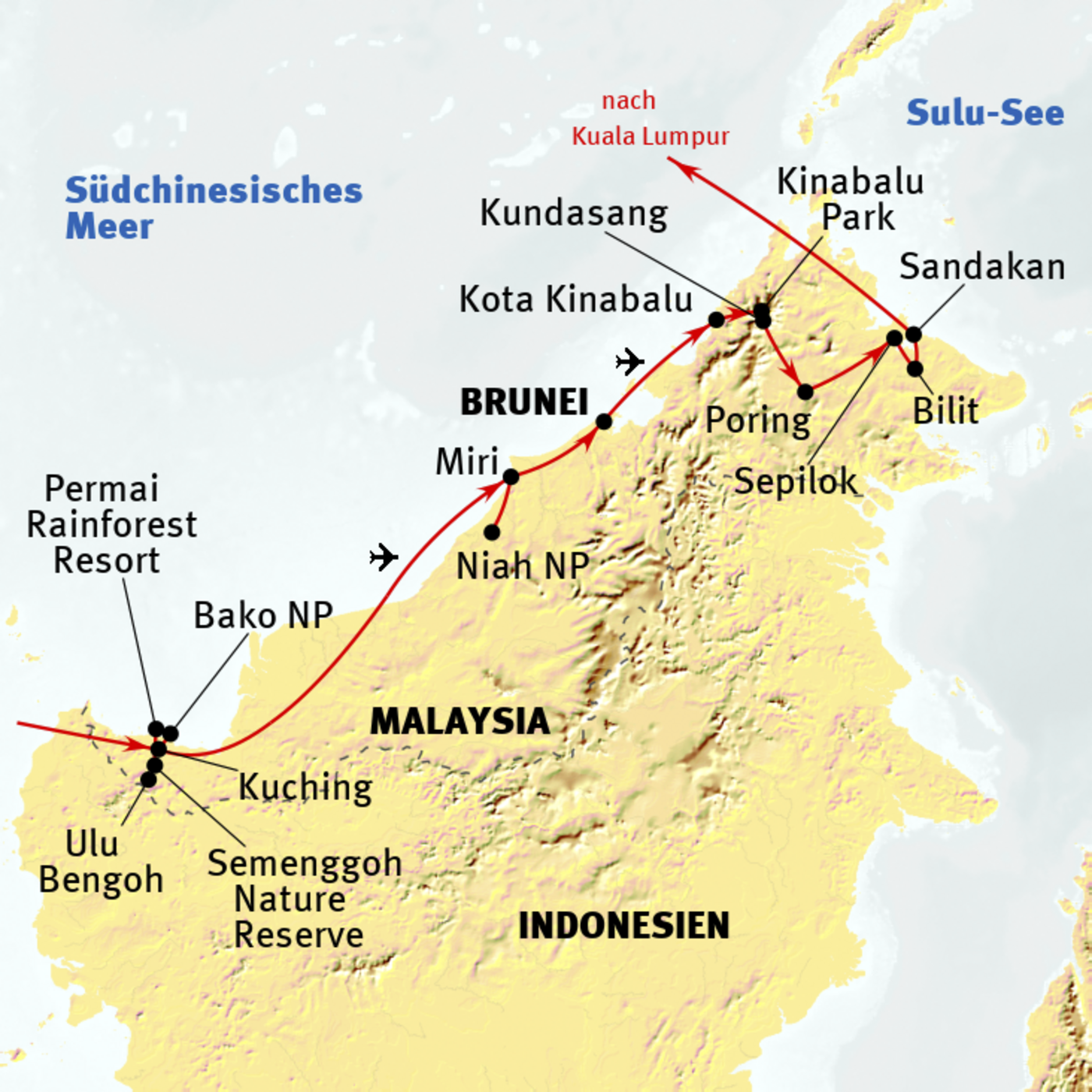 Kuching - Ulu Bengoh -Damai Beach - Bako Nationalpark - Miri - Brunei - Kota Kinabalu - Mt. Kinabalu Nat. Park - Sepilok - Kinabantang Fluss - Kuala Lumpur