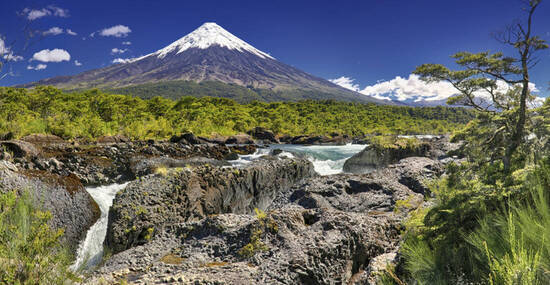 Entlang des Llanquihue-Sees geht die Fahrt mit Blick auf die Vulkane Osorno und Calbuco in den Nationalpark Vicente-Perez-Rosales und zu den Wasserfällen von Petrohue, die wild über das dunkle Lavagestein sprudeln. Nach einer Bootsfahrt auf dem Allerheiligensee geht es dann hinauf auf den majestätischen Vulkan Osorno (bis 1.200m). Wir unternehmen eine leichte Wanderung auf den erkalteten Lavafeldern und verbessern mit jedem Höhenmeter den fantastischen Panoramablick auf die umliegenden Vulkane und den tiefblauen See tief unter uns.