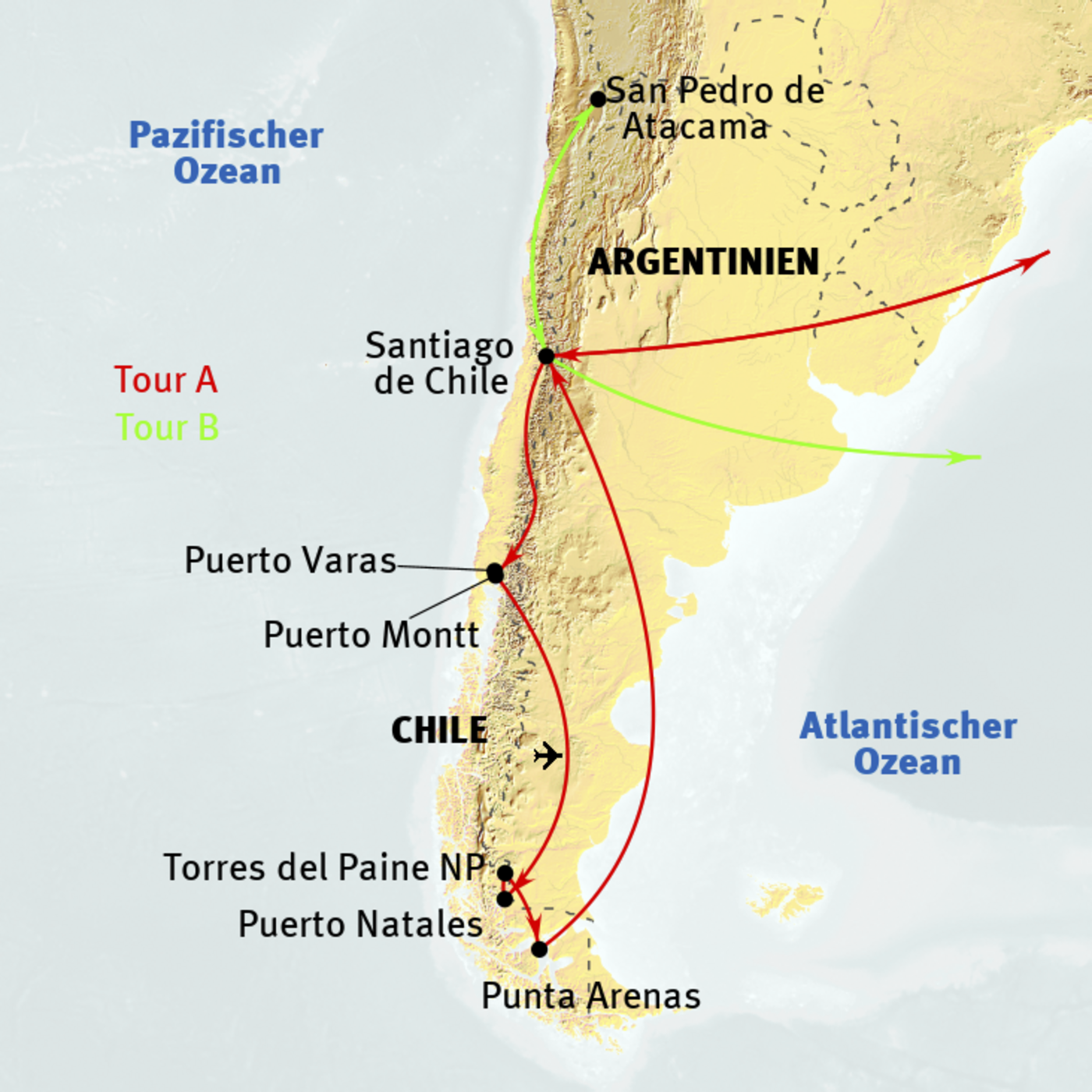 Chile - mehr landschaftliche Kontraste und Gegensätze als dort finden sich in kaum einem anderen Land der Erde. Der von Nord nach Süd über 4.500 km lange, aber nur 180 km breite Landstreifen bietet vielfältigste Landschaftsformen auf dieser fantastischen Reise für Naturliebhaber, ideal für "Chile-Neulinge". Wir konzentrieren uns auf herausragende Naturwunder: das Seengebiet mit dem Lago de Todos los Santos und dem Osorno-Vulkan, Süd-Patagonien mit seiner Steppenlandschaft und den Gipfeln des Torres del Paine-Nationalparks. Bei Tour B kommt die Atacama-Wüste mit Ihren Salzseen und Geysir-Feldern hinzu. Ausgangs- und Endpunkt ist die Hauptstadt Santiago de Chile mit der Option, im Anschluss die Osterinsel zu besuchen. Wir übernachten in zentral gelegenen Unterkünften und überbrücken die enormen Distanzen teils per Flugzeug. Eine ideale Einstiegsreise in das faszinierende Land am Ende der Welt!