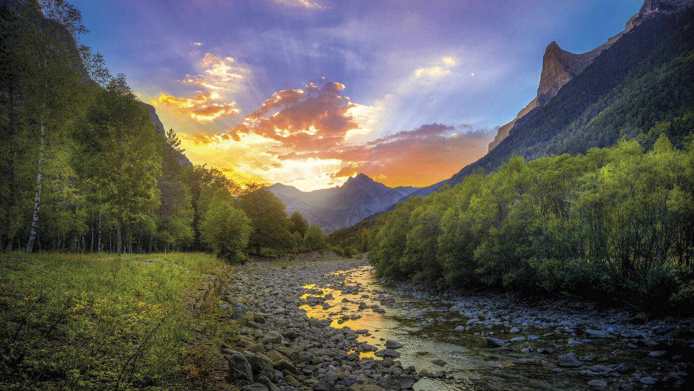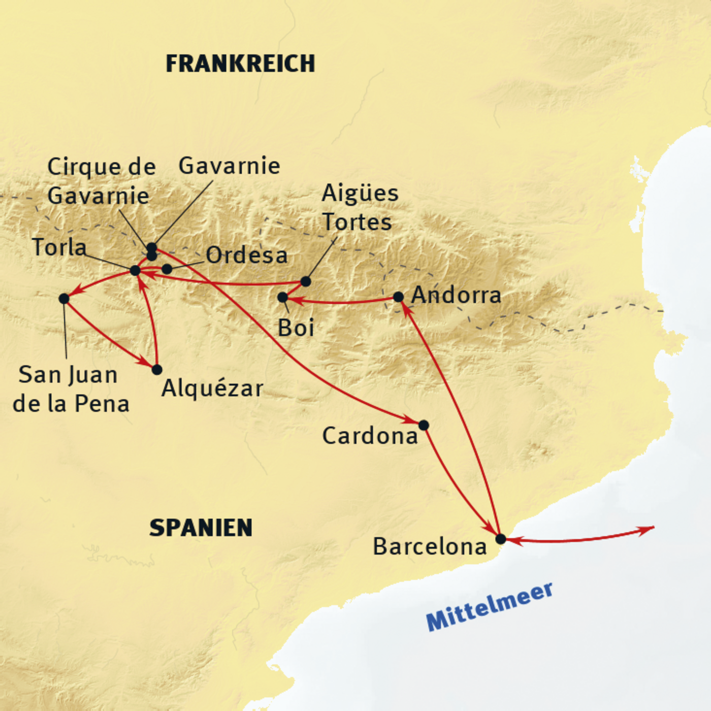 Wild und majestätisch erhebt sich die Bergkette der Pyrenäen vom Kantabrischen Meer bis zum Mittelmeer und bildet dabei die natürliche Grenze zwischen Spanien und Europa. Mit einer Länge von ca. 450 Kilometern beginnt sie mit welligen Hügeln und erreicht Gipfel von rund 3.300 Metern Höhe. Die malerischen Täler verlaufen meist quer zum Hauptkamm, was die Region wenig erschlossen und noch relativ unbekannt macht. Besucher finden traditionsreiche Orte, einsame Gipfel, Wälder und Seen sowie Täler wie das Val d’Aran und Vall de Boí mit romanischen Kirchen, die UNESCO-Weltkulturerbe sind. Die einzigartige Flora und Fauna bietet Tieren wie dem Bartgeier Lebensraum. Der spanische Nationalpark Ordesa y Monte Perdido und der französische Nationalpark Pyrenäen sind herausragende Naturschätze.