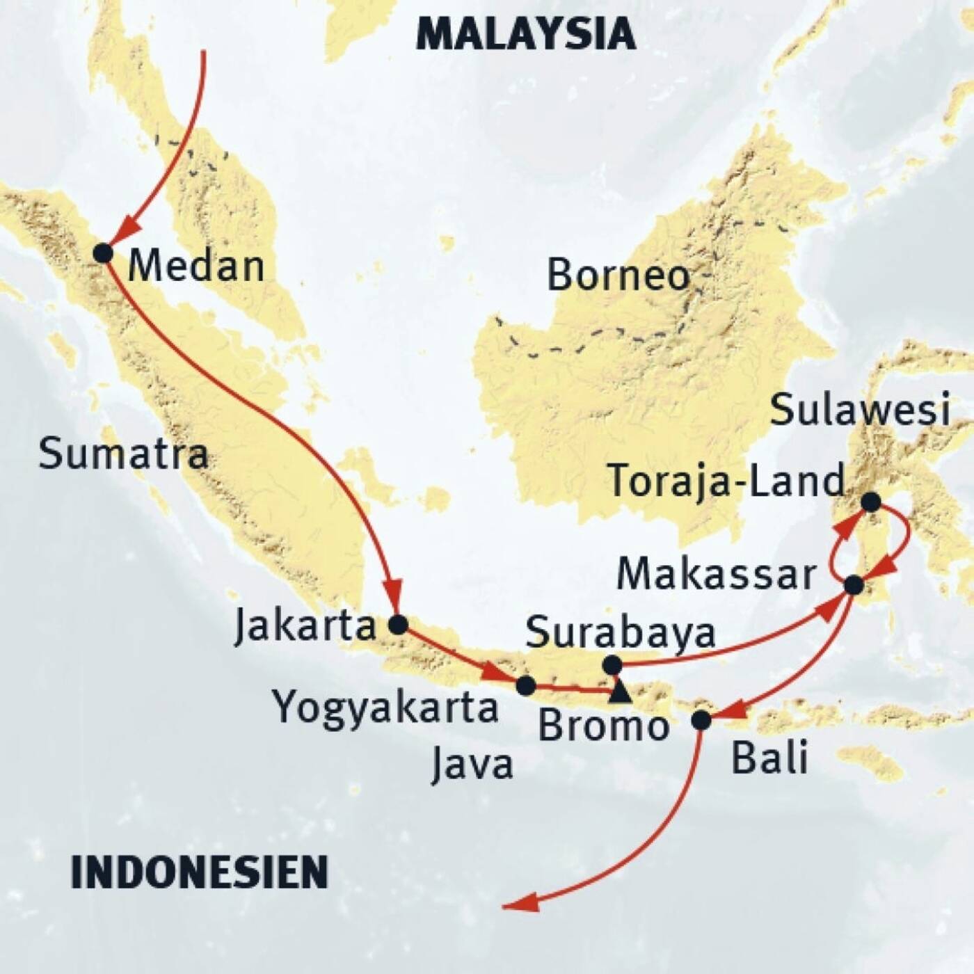Keine andere Region in Südostasien hat so viele unterschiedliche Landschaftsräume und eine so reiche kulturelle Vielfalt zu bieten, wie das indonesische Archipel. Der Einfluss verschiedener Religionen und Kulturen hat auf den Inseln einzigartige Spuren hinterlassen. Auf Sumatra und Sulawesi finden wir archaische, animistische Kulturen bei den Batak- und Toraja-Völkern, während Java und Bali durch Islam, Hinduismus und Buddhismus geprägt sind. Besonders in Zentral-Java zeugen Baudenkmäler wie der Borobudur- oder Prambanan-Tempel von versunkenen Hochkulturen. In Bali wiederum hat sich eine ganz besondere Ausprägung des Hinduismus bis heute erhalten. Die freundlichen Menschen und das hoch entwickelte Kunstschaffen machen die Inselwelt faszinierend. Tropische Landschaften mit Vulkanen, Reisfeldern und Traumstränden laden zu einem Besuch ein. Wir möchten Ihnen diese Vielfalt näherbringen.
