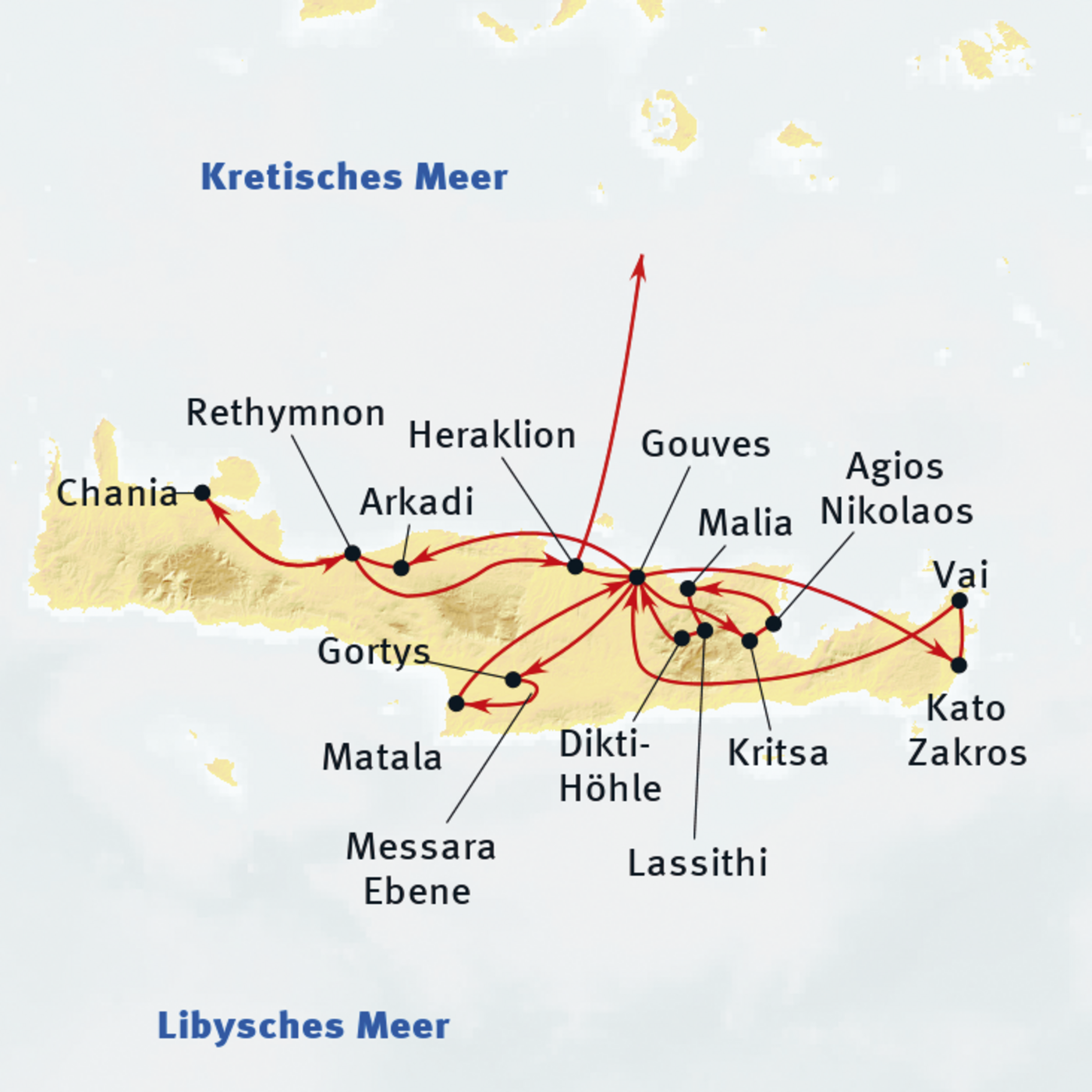 Je nach Abflugszeit steht uns der Vormittag zur freien Verfügung. Transferbus (ohne Reiseleitung) zum Flughafen in Heraklion und Rückflug nach Frankfurt.