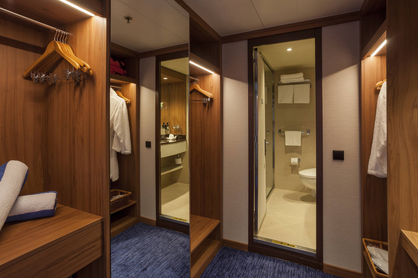 Alle Kabinen mit Dusche, WC, Föhn, TV-Flachbildschirm, Telefon, Safe, Kühlschrank, individuell regulierbare Klimaanlage. /Kat. 16 zusätzlich Whirlpool-Badewanne