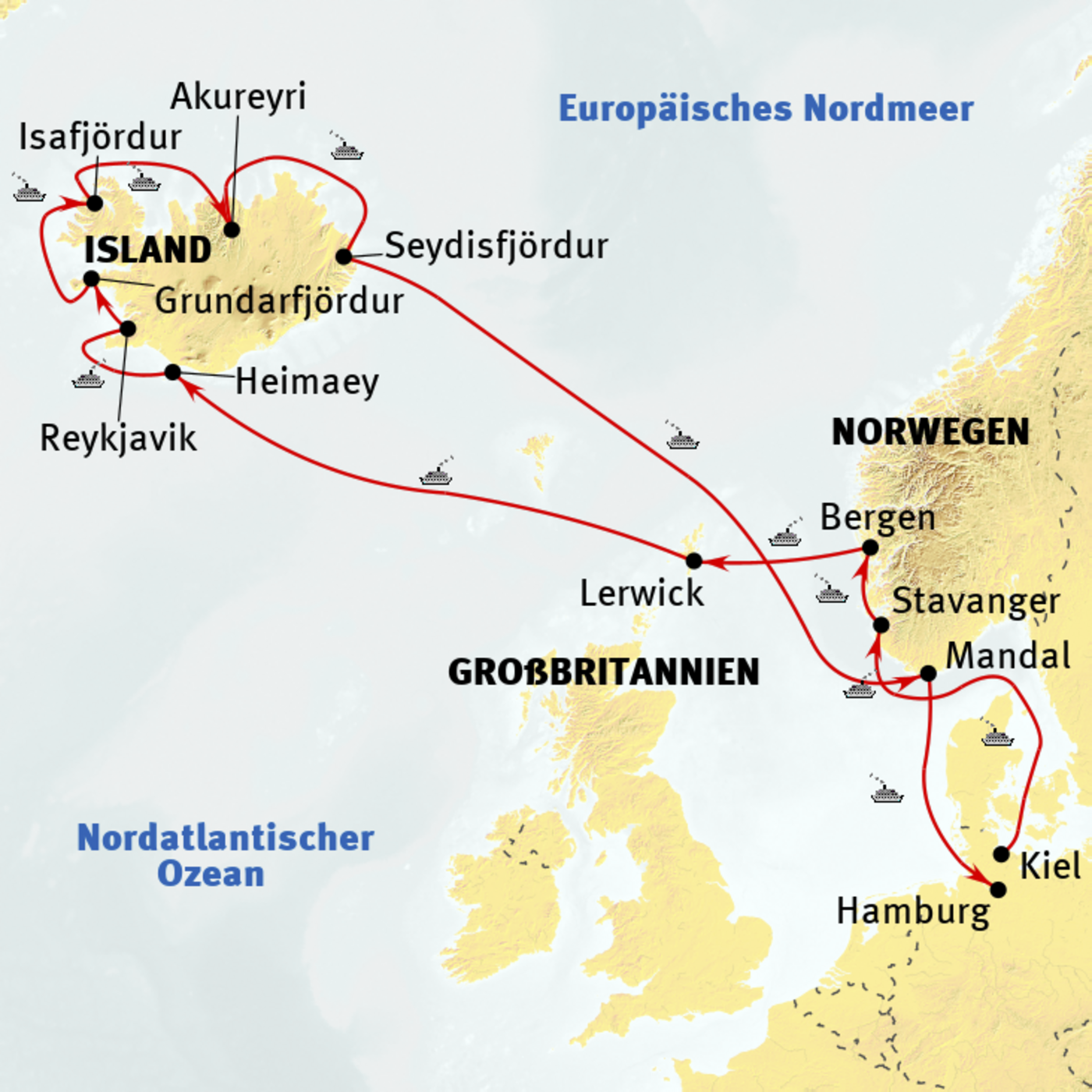 Kiel - Stavanger - Bergen - Lerwick - Heimaey - Reykjavik - Grundfjördur - Isafjördur - Akureyri - Seydisfjödur - Mandal - Hamburg