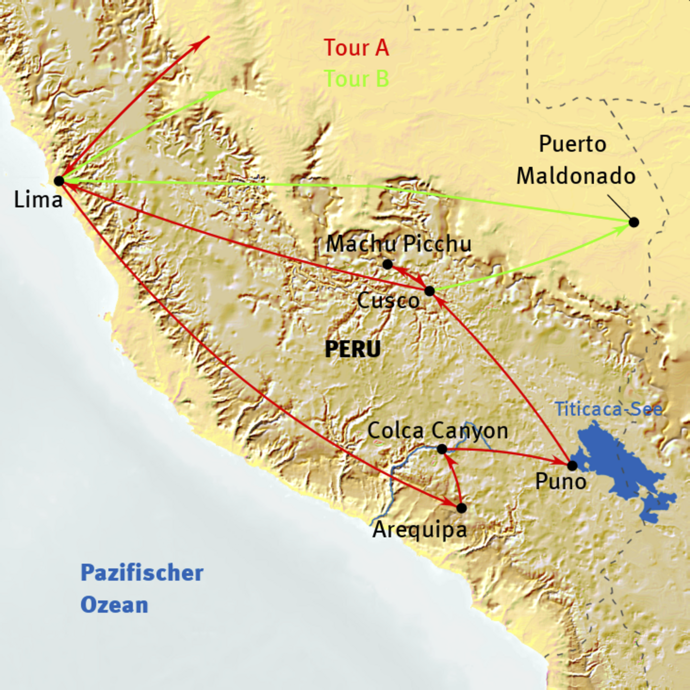 - bei Tour B zusätzlich Amazonas-Tiefland und Tambopata-Naturreservat