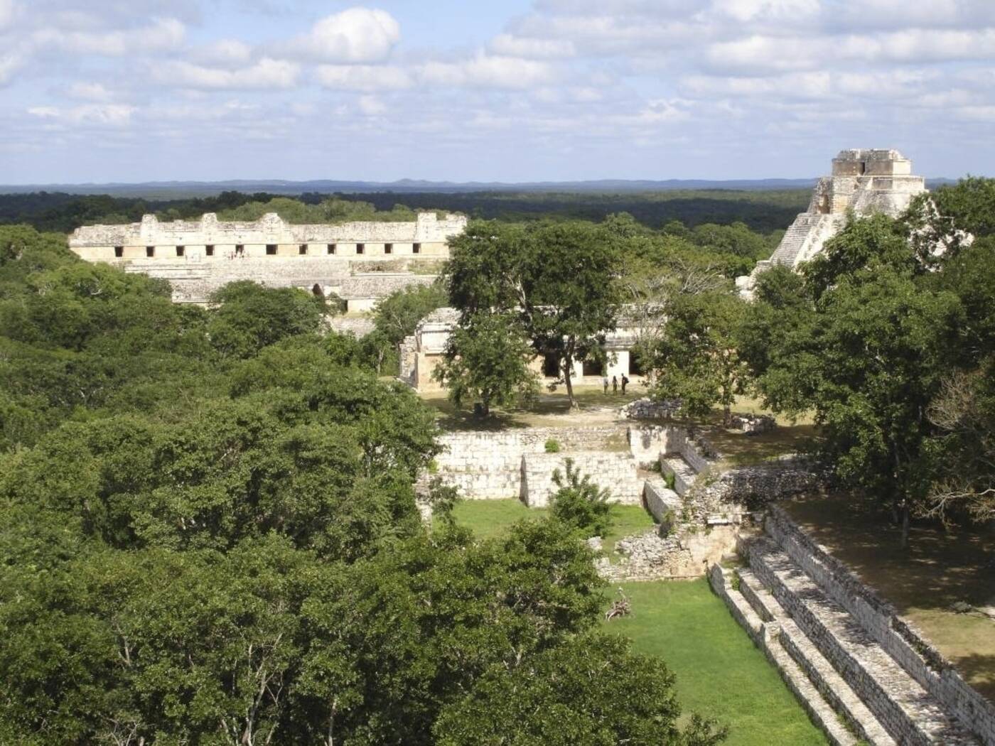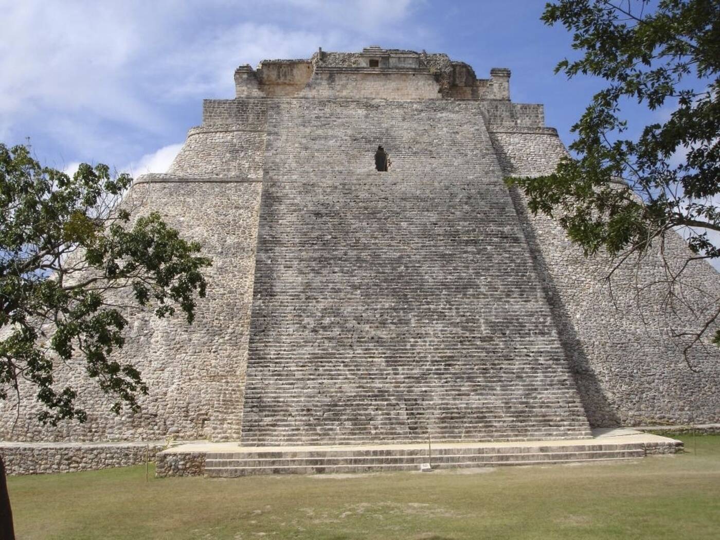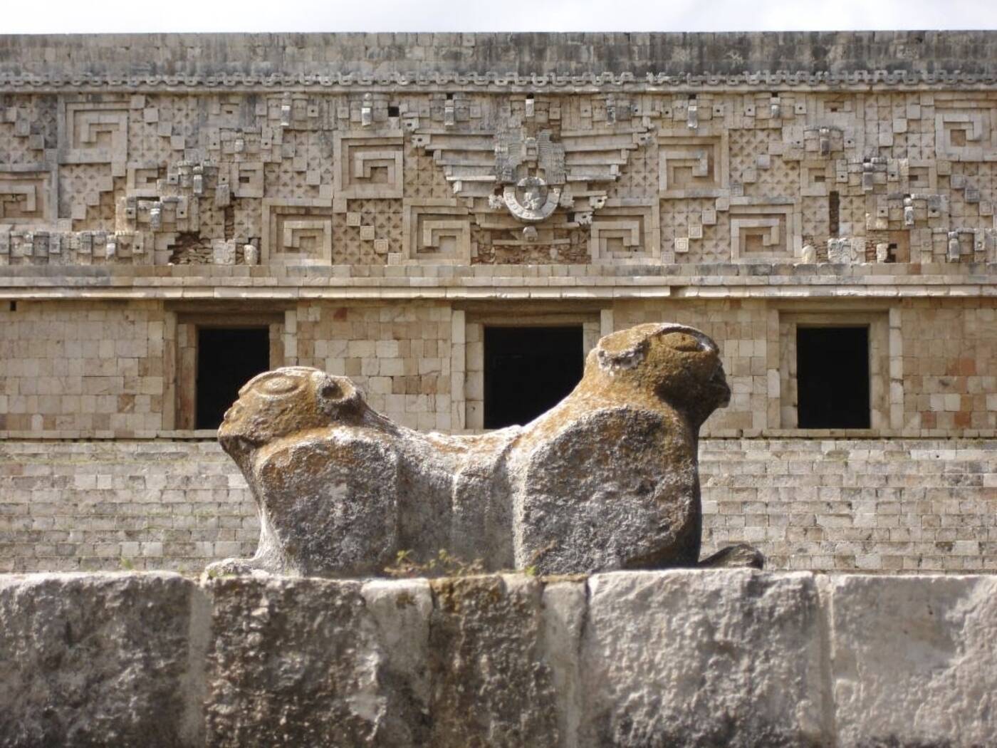 Wir tauchen ein in die Geschichte der spätklassischen Maya-Epoche. Der Name Uxmal steht für „die dreimal Erbaute“. Ungefähr 600 – 950 n. Chr. entstanden, konnte die Bedeutung vieler Bauten bis heute noch nicht vollständig entschlüsselt werden. Die Anlage beeindruckt den Besucher mit verzierten Fassaden, riesigen Terrassen und Plätzen, Säulen und Torbögen.