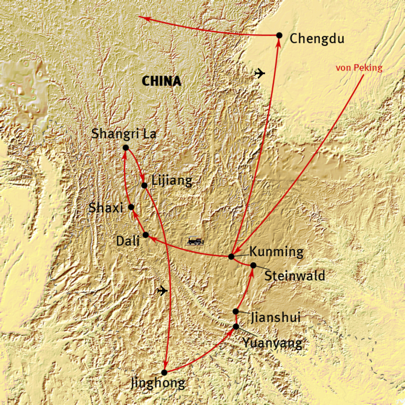 Peking - Kunming - Dali - Shaxi - Shangri La - Lijiang - Xishuangbanna (Jinghong) - Yuanyang - Jianshui - Kunming - Chengdu