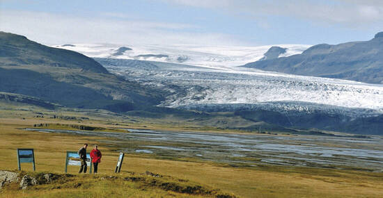 Auf der Fahrt entlang der Küste können wir das Kräftespiel der Elemente beobachten: Gletscher, darunter verborgene Vulkane und die Brandung haben die Landschaft am gewaltigen Gletscher Vatnajökull, mit über 8.000 km² größter Gletscher Europas, geformt. Durch das Sandergebiet Skeidararsandur fahren wir zum Nationalpark Skaftafell. Ein Höhepunkt des heutigen Tages ist die Wanderung zum Wasserfall Svartifoss, eingerahmt von Basaltsäulen. Bei guter Sicht bietet sich der Blick auf den höchsten Berg Islands, den 2.110m hohen Hvannadalshnjukur. Weiter östlich liegt die Gletscherlagune Jökulsarlon, auf der Eisberge verschiedenster Größe treiben, bevor sie den Weg hinaus aufs Meer finden. Eine Bootsfahrt auf Amphibienfahrzeugen bringt uns in die Nähe der weiß, blau und schwarz leuchtenden Eisriesen (Tagesdistanz ca. 300 km).