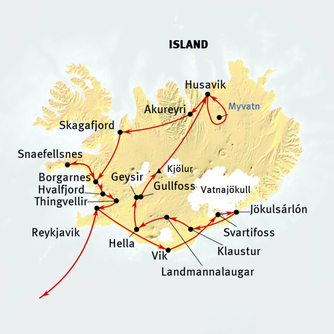 Reykjavik - Gullfoss - Skaftafell Nationalpark - Hochland - Myvatn - Akureyri - Halbinsel Snaefellsnes - Thingvellir Nationalpark