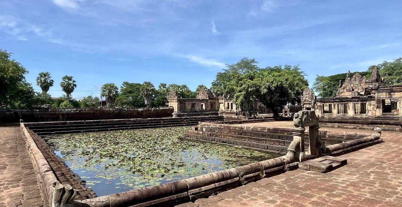 Etwa 20 Minuten von Phanom Rung entfernt, neben einem riesigen Wasserreservoir, liegt die Tempelanlage Prasat Muang Tam. Sie wurde ebenfalls für den hinduistischen Gott Shiva errichtet. Vom Eingang der Anlage, eingerahmt in eine große Grünfläche, präsentiert sich in deren Mitte der quadratische Tempelkomplex. Von einer Mauer umgeben, geht es durch den östlichen Tordurchgang in das Innere. Im Tempelinnern befinden sich vier Wasserbecken, jeweils symmetrisch in den Ecken der Anlage angeordnet – fünfköpfige Schlangen verzieren diese. Die Tempelanlage und die umliegende Natur haben, wie ich finde, etwas sehr harmonisches und beruhigendes an sich. Fast menschenleer ist es hier. Ein Ort zum Nachdenken.