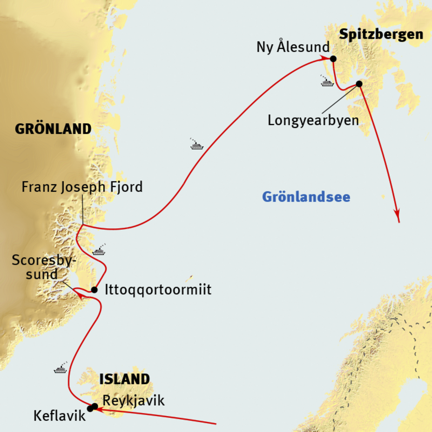 Diese Expeditions-Seereise beginnt auf Island in der quirligen Hauptstadt Reykjavik. Das lebendige Örtchen bietet uns die Möglichkeit vor der Seereise durch die Gassen zu schlendern und die wunderschöne Landschaft rundherum zu genießen. Endlich an Bord der SEA SPIRIT fahren wir Richtung Grönland. Unser Ziel ist die raue Küste Ostgrönlands. Das gewaltige Fjordsystem Scoresbysund und die beeindruckende meist menschenleere Küstenlinie werden uns in ihren Bann ziehen. In den tiefen Meeresarmen treffen wir auf riesige Eisberge, sichten Robben und - mit Glück - auch Wale. Mit unseren bordeigenen Zodiacs unternehmen wir Anlandungen um zu wandern und die Landschaft zu genießen. Unsere Reise endet auf der nördlichsten Inselgruppe im Nordpolarmeer, auf Spitzbergen. Die Küste ist geprägt von hohen Bergen und tiefen Fjorden, an deren Ende unzählige Gletscherzungen bis ans Meer reichen und Abbruchkanten steil aus dem Wasser aufragen. Die hiesige Tierwelt ist reich an Seevögeln und es besteht die Möglichkeit Rentiere zu sehen.