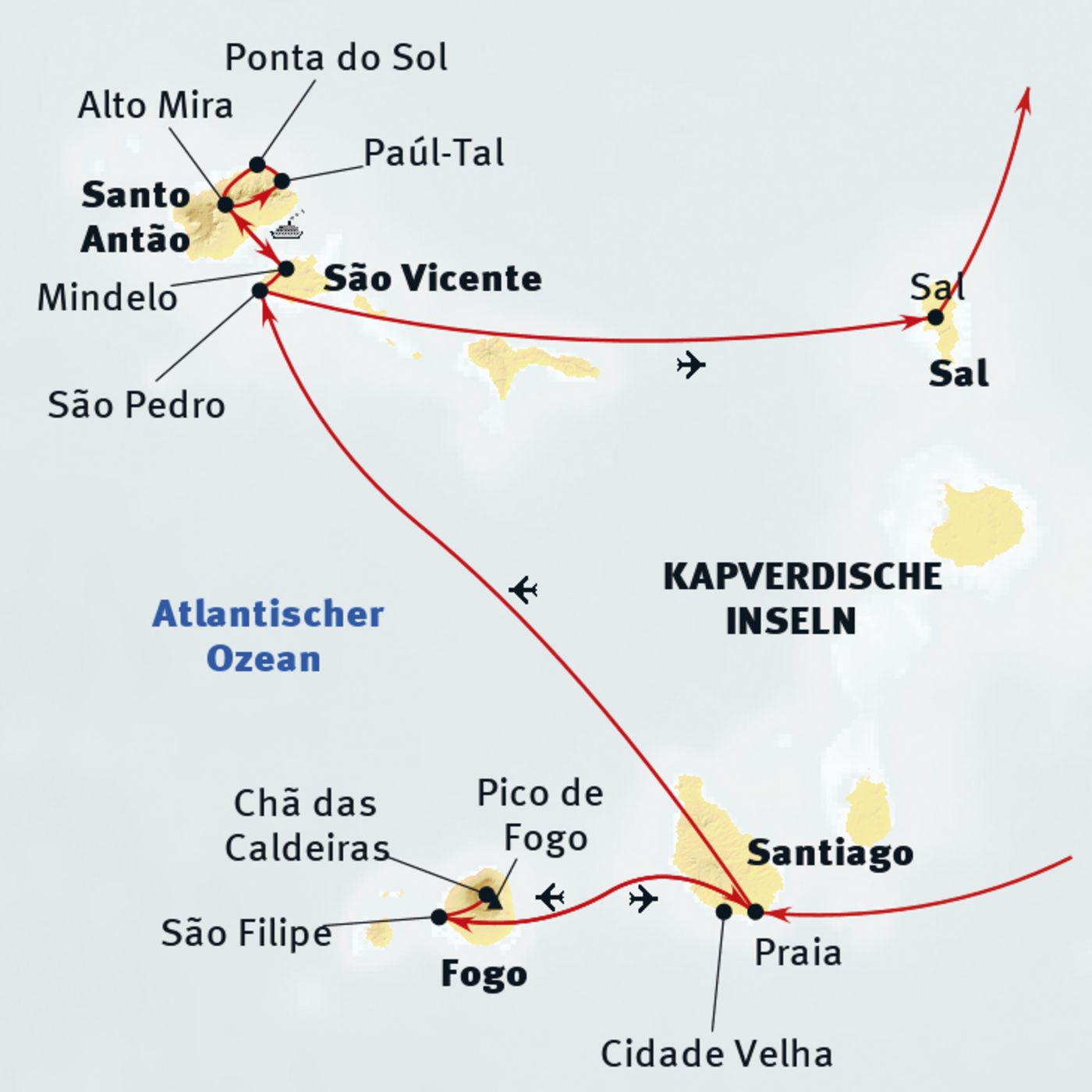 Insel Santiago: Praia - Plato - Ribeira Grande - Cidade Velha - Insel Fogo: Sao Filipe - Pico Pequenho - Insel Sao Vicente: Mindelo - Insel Santo Antao: Cha de Morte - Paul-Tal - Ponta do Sol - Insel Sao Vicente: Mindelo - Insel Sal