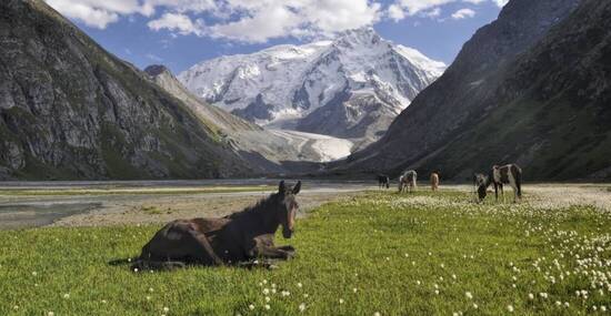 Durch die idyllische Kurtka-Schlucht und über den 3.300m hohen Pass Moldo Schoo mit überwältigenden Ausblicken, fahren wir heute zum Gebirgs-See Son Kul, der zweitgrößte See Kirgistans. Er liegt auf 3.016m Höhe, eine der reizvollsten Szenerien des Landes, voller saftiger Wiesen, die während der Sommermonate von Hirten mit ihren Schaf-, Pferde- und Yak-Herden aufgesucht werden. Nach Ankunft Wanderung in den umliegenden Bergen.