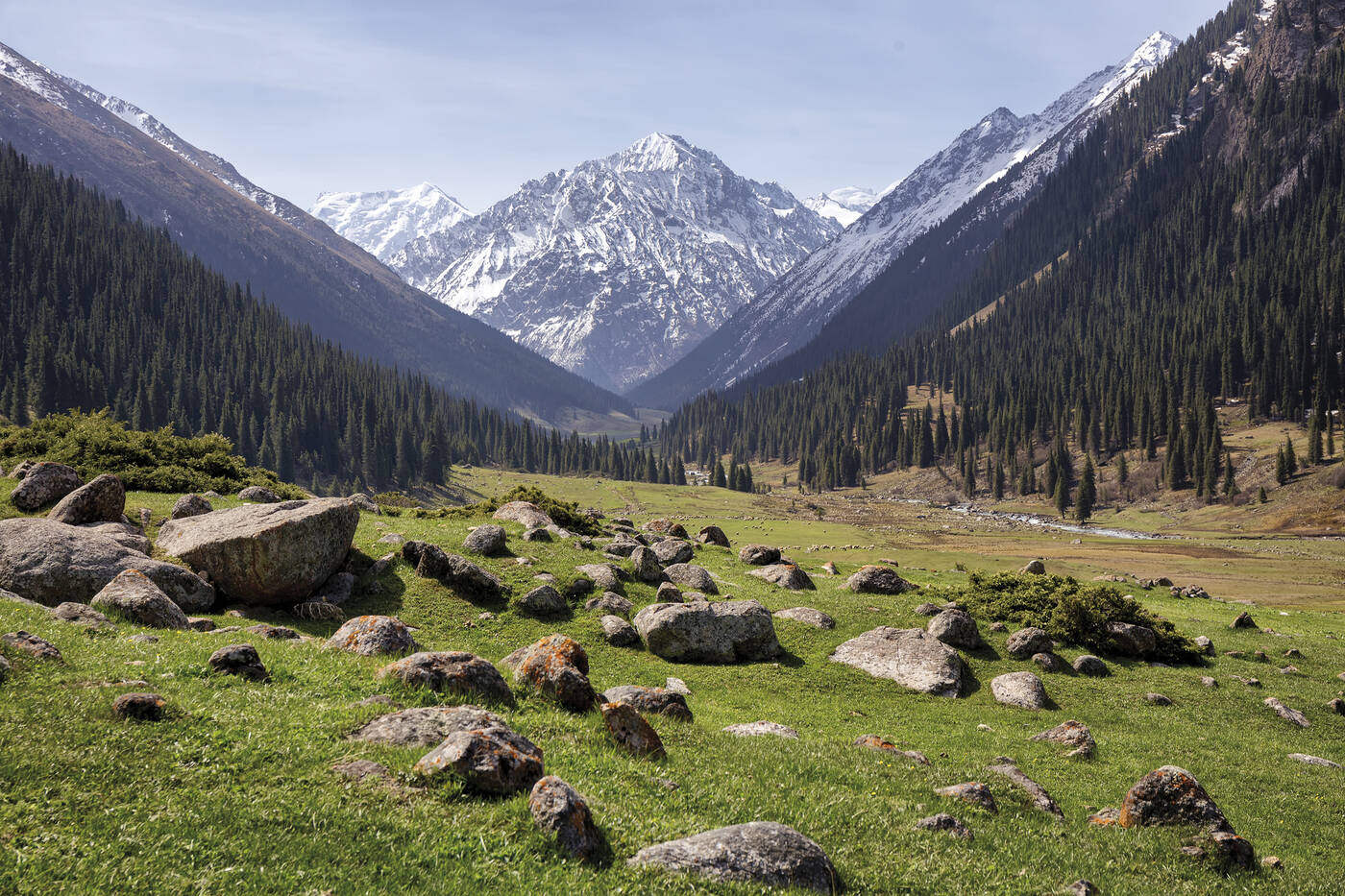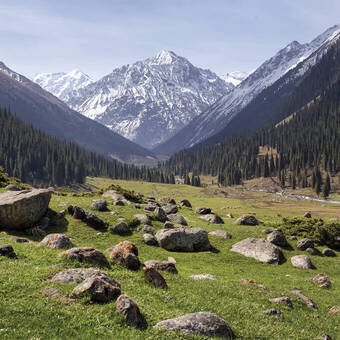 Um den typisch zentralasiatischen Viehmarkt erleben zu können, heißt es heute früh aufstehen. Bereits um 05.00 Uhr werden wir abgeholt und tauchen im ersten Morgengrauen in das geschäftige Treiben ein: Unter dem Licht der Fahrzeugscheinwerfer werden Schafe, Ziegen, Rinder und Pferde abgeladen, begutachtet und gehandelt – ein lebendiges Spektakel, das die traditionelle Lebensweise der Region eindrucksvoll widerspiegelt. Im Anschluss fahren wir zur Ak-Suu-Schlucht, die nur rund 15 km von Karakol entfernt liegt. Die Schlucht gilt als eine der landschaftlich schönsten Regionen des östlichen Tianshan-Gebirges. Majestätische Viertausender, weitläufige Gebirgswiesen, dicht bewachsene Tannen- und Wacholderwälder sowie das klare Berglicht schaffen eine eindrucksvolle Kulisse für unseren Ausflug. Berühmt ist die Ak-Suu-Schlucht außerdem für ihre Thermalquellen.