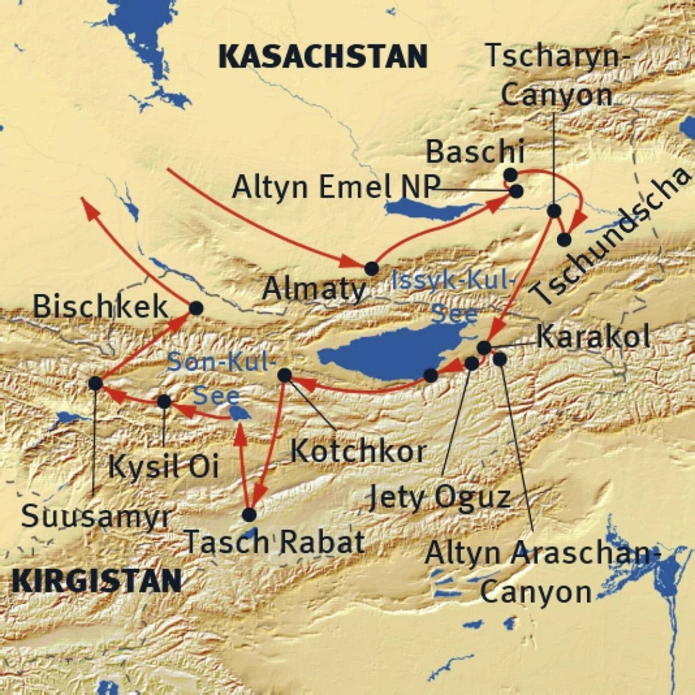 Almaty - Altyn Emel - Bastschi - Jergelan - Karakol - Altyn-Araschan - Jety-Oguz - Kotschkor - Tasch Rabat - Son Kul-See - Kysyl Oi - Bischkek