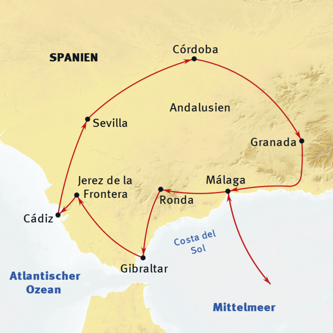 Andalusien ist eine der schönsten und exotischsten Regionen Spaniens. Von schneebedeckten Gipfeln, geheimnisvollen Höhlen, weiten Ebenen, Naturschutzgebieten und Gebirgslandschaften über jahrtausendealte Städte bis hin zu schönen Stränden, bietet Andalusien eine Vielfalt an Erlebnissen. Architektonische Schätze und regionale Traditionen zeugen von einem reichen kulturellen Erbe früherer Völker. Die Andalusier feiern mit Leidenschaft ihre Feste. Besonders die Städte, die auf dieser Kooperations-Rundreise besucht werden, wie Sevilla, Córdoba und Granada, besitzen außergewöhnlichen Charme. Sevilla, Hauptstadt Andalusiens, ist bekannt für seine Barbiere und als Flamenco-Wiege. Córdoba war Sitz der Kalifen, ein kultureller Schmelztiegel. Granada, berühmt durch die Alhambra, genießt internationale Bekanntheit.
