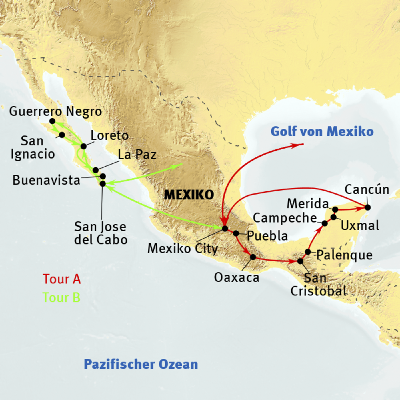 Mexiko bietet eine bemerkenswerte Vielfalt an Kulturmonumenten – von der Antike der Mayas bis zur modernen Architektur, eine atemberaubende Landschaft und nicht zuletzt seine lebenslustigen und humorvollen Einwohner. Das Land verkörpert pure Exotik mit vielen Facetten. Daher verwundert es nicht, dass Mexiko hier in verschiedenen Rundreisen vorgestellt wird. Unser Reiseprogramm ist ausgewogen gestaltet, mit moderaten Entfernungen. Auf einer zweiwöchigen Rundreise erleben wir das Hochland Mexikos sowie die üppige Vegetation der Halbinsel Yucatán. Wir erkunden zahlreiche Ausgrabungsstätten entlang der Ruta Maya und gewinnen Einblicke in die Lebensweise der ehemaligen Hochkulturen der Tolteken, Zapoteken und Mayas. Als Abschluss bieten sich erholsame Tage in Cancún, Playa del Carmen oder an anderen Stränden der Riviera Maya an. Alternativ kann die Tour BAJA CALIFORNIA als Kombination für eine 25-tägige Reise gebucht werden.
