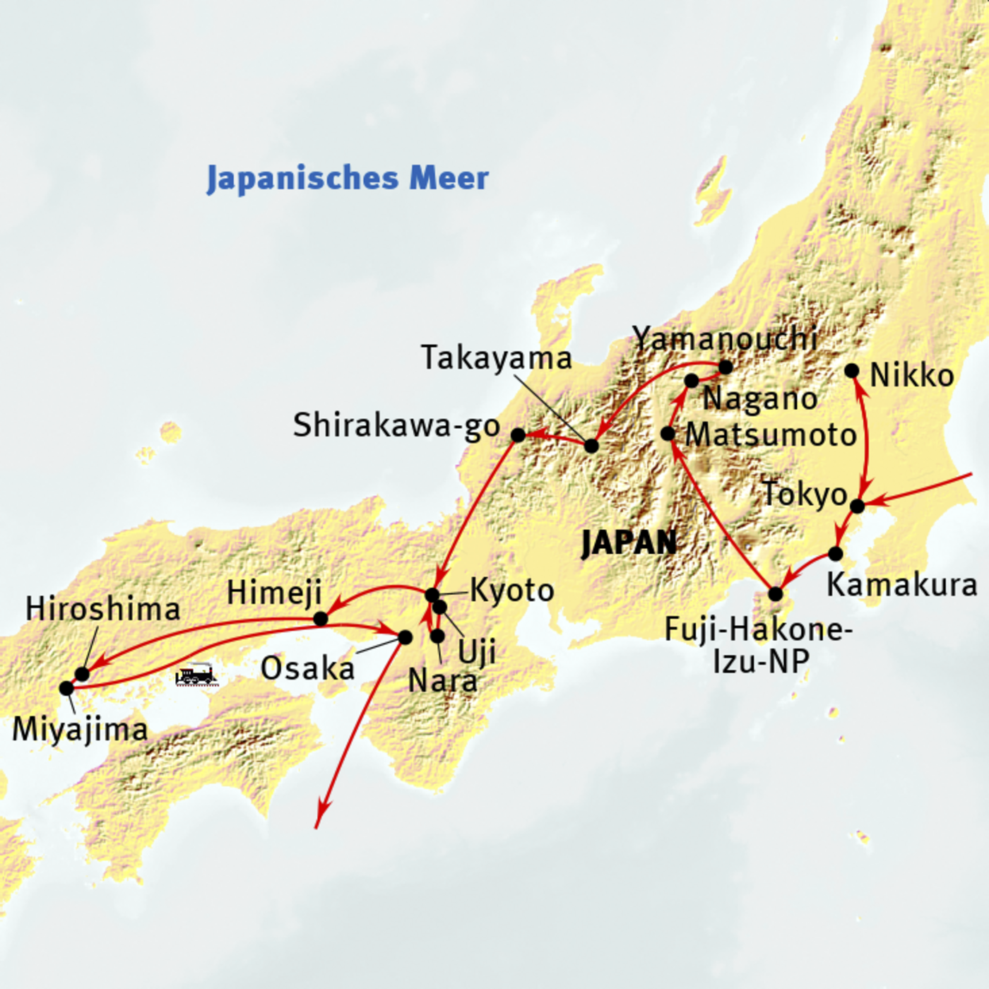 Toyko – Nikko – Tokyo – Kamakura – Fuji-Hakone-NP – Matsumoto – Nagano – Yamanouchi – Takayama – Shirakawa-go – Takayama – Ise-Schrein – Kyoto – Uji/Nara – Kyoto – Himeji – Hiroshima – Osaka