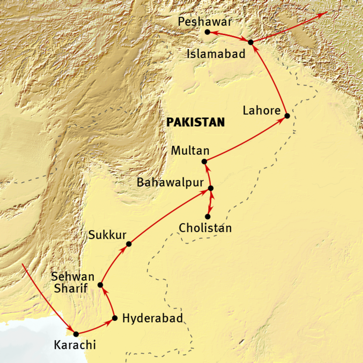 Karachi - Hyderabad - Shewan Sharif - Sukkur - Bahawalpur - Multan - Lahore - Islamabad - Peshawar - Rawalpindi - Islamabad