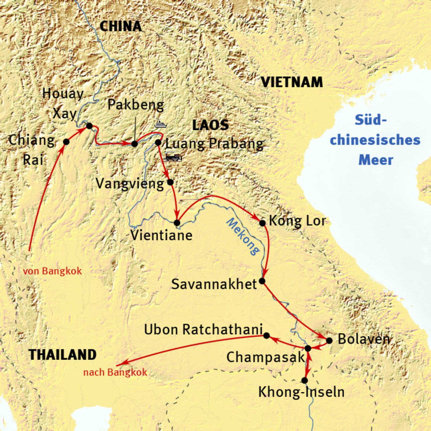 Chiang Rai - Houay Xai - Pakbeng - Luang Prabang - Vangvieng - Vientiane - Kong Lor - Savannakhet -Bolaven-Plateau - Champasak - Wat Phou - Kong-Inseln - Ubon Ratchathani - Bangkok