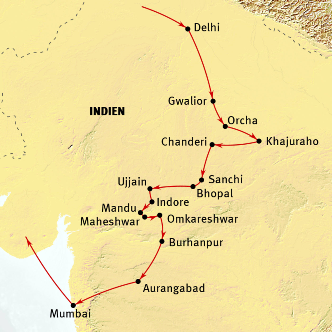 Delhi - Gwalior - Orcha - Khajuraho - Chanderi - Orcha - Jhansi - Bhopal - Sanchi - Ujjain - Indore - Mandu - Maheshwar - Omkareshwar - Burhanpur - Ajanta Caves - Aurangabad - Mumbai