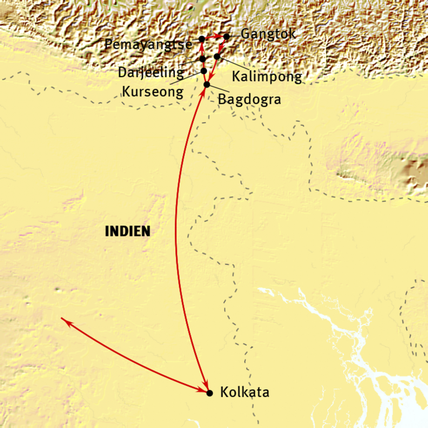 Eine Reise durch Westbengalen und Sikkim ist ein einzigartiges Erlebnis. Atemberaubende Landschaften, reiche Kultur und unvergessliche kulinarische Erfahrungen warten auf uns. Wir beginnen in Kolkata, der kulturellen Wiege Indiens, die Tradition und Moderne vereint. Als nächstes besuchen wir Darjeeling, bekannt für seinen Tee und den legendären Toy Train, malerisch in den Teeplantagen auf 2.100 m Höhe gelegen. Weiter nördlich liegt Sikkim, einst ein eigenständiges Königreich, umgeben vom majestätischen Kanchenjunga. Die uralten, bewirtschafteten Klöster vor der Kulisse der Himalaya-Riesen machen Sikkim zum Traumziel für Naturliebhaber mit Interesse am Buddhismus. Unsere Reise durch Westbengalen und Sikkim bietet für jeden etwas – Geschichts- und Kulturliebhaber, Abenteuerlustige und Entdecker.
