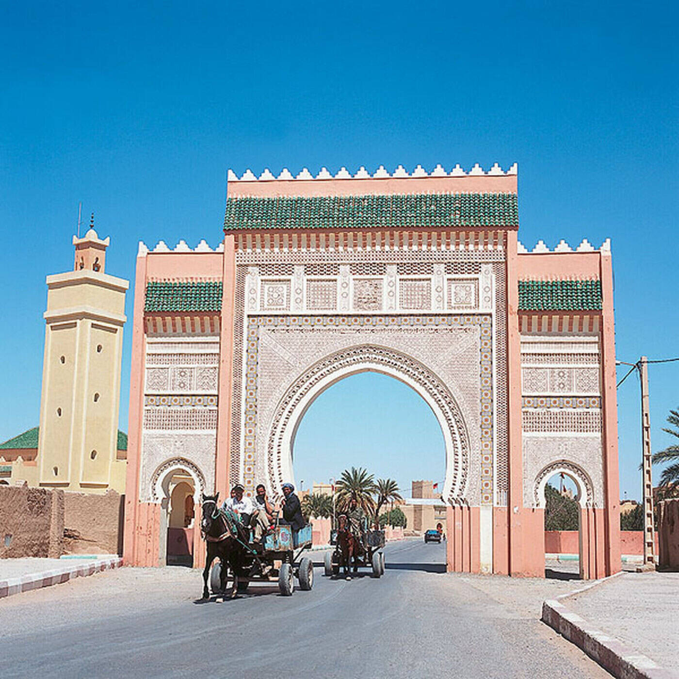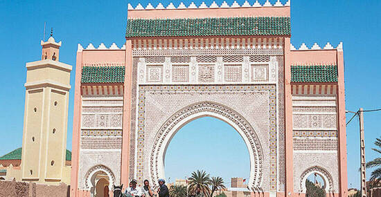 Über Ifrane und Azrou im Mittleren Atlas und den Col du Zad (2.180 m hoch) geht es zu den ariden Hochplateaus. Teepause bei einer Nomadenfamilie und Mittagsrast in Midelt. Dann durch den Hohen Atlas über Tizi’n Talrhemt (2.260 m) zur malerischen Ziz-Schlucht. Die Landschaft, Vegetation und auch die Architektur der Häuser ändert sich, wir nähern uns der Wüste. Abends in Errachidia (340 km, 7 Std.).