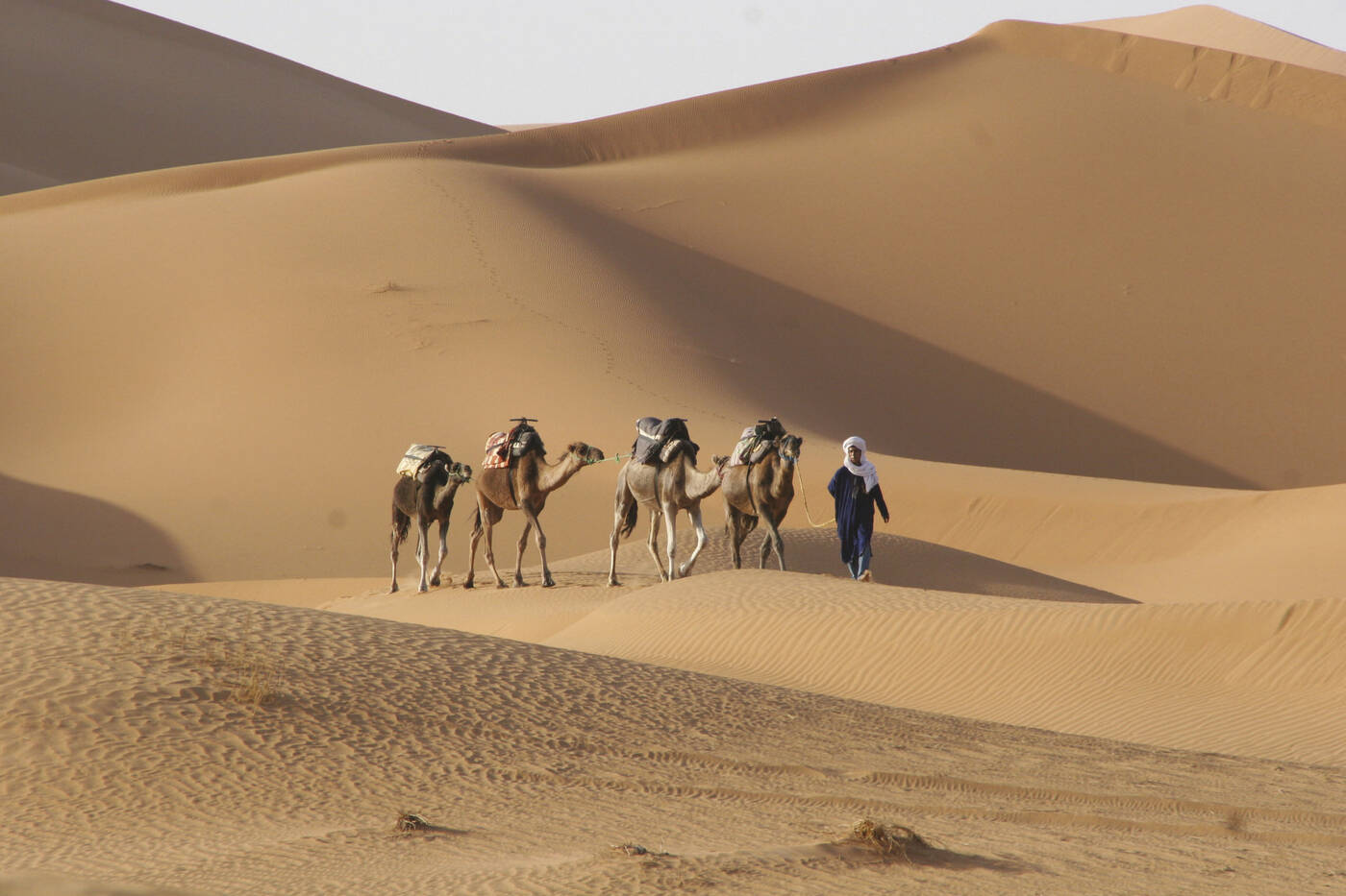 Über Erfoud und das palmenumsäumte Tafilalet-Tal geht es nach Rissani, einem alten Karawanen-Knotenpunkt. Nach der Stadtbesichtigung genießen wir eine traditionelle "Berber-Pizza". Dann fahren wir zu den Dünen in Merzouga. Unterwegs Teepause bei einer Nomadenfamilie. Nachmittags lauschen wir traditioneller Gnaoua-Musik im Dorf Khamliya. (130km, 2,5 Std.)
