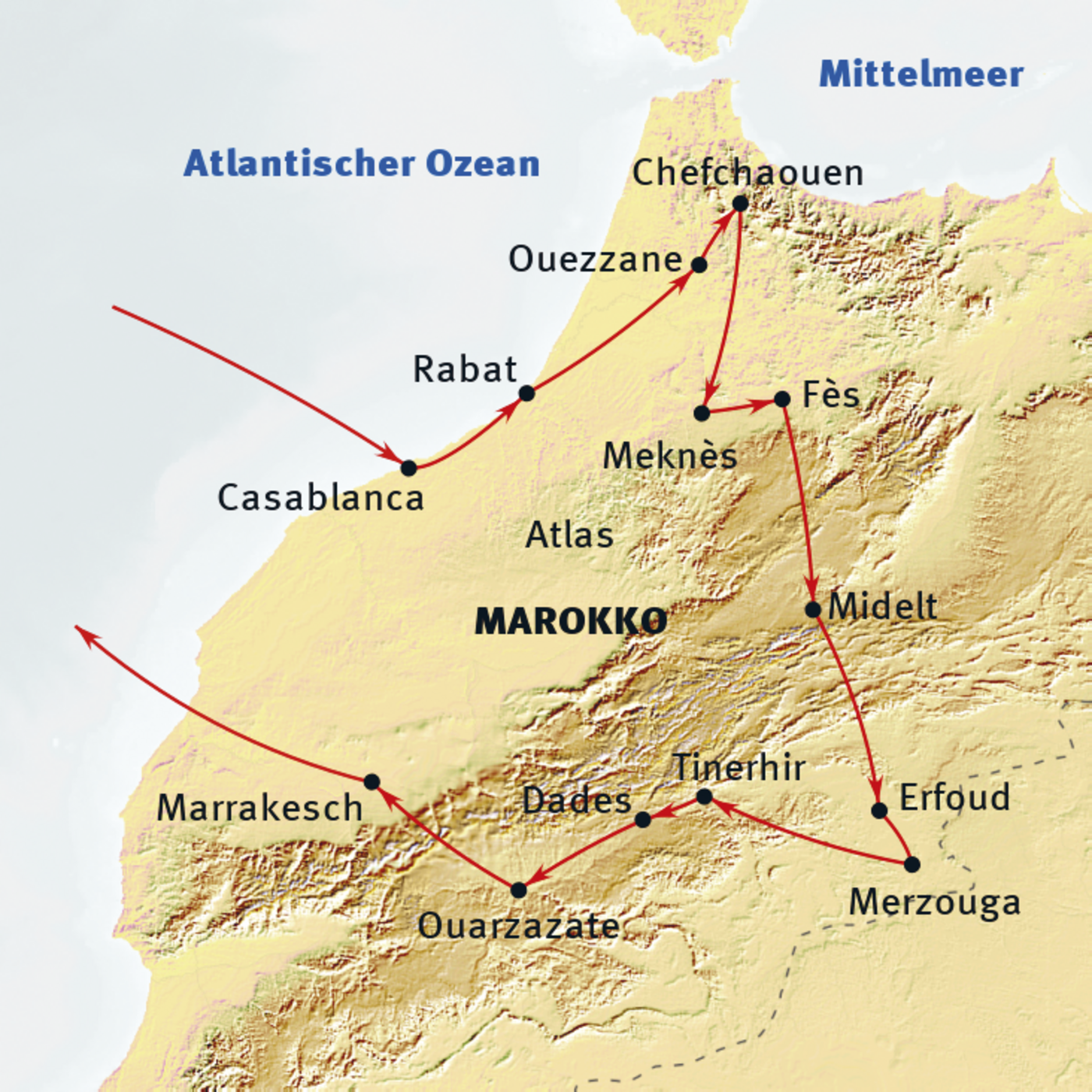 Casablanca - Rabat - Chefchaouen - Azilane - Moulay Idriss - Volubilis - Meknès - Fès - Ifrane - Azrou - Midelt - Errachidia - Rissani - Merzouga - Erg Chebbi - Tinerhir - Todra-Tal - Dades-Schlucht - Ait Ben Haddou - Marrakesch