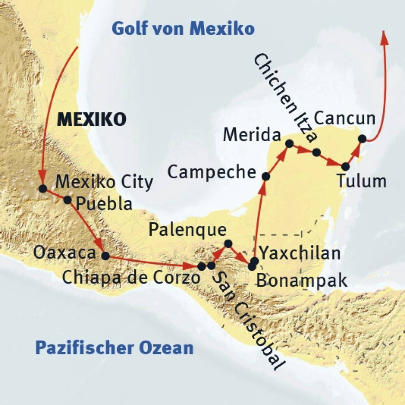 Mexiko fasziniert mit seiner Vielfalt an Landschaften und seinen einzigartigen archäologischen Stätten. Dieses Programm ist für Reisende, die Mexiko authentisch erleben möchten und bereit sind, dafür kleinere Unannehmlichkeiten in Kauf zu nehmen: Wir stehen früh auf, um die Ruinen als Erste zu erkunden und die Pyramiden sowie Kultstätten in Ruhe auf uns wirken zu lassen. Verschiedene Vegetationszonen und Indio-Dörfer erschließen wir uns bei mehreren Wanderungen. Obwohl wir die kulturellen Höhepunkte der klassischen Route von Mexico City bis Cancun nicht auslassen, ergänzen aktive Teile wie Wanderungen und Stadtrundgänge die Reise. Eine Trekkingtour im herkömmlichen Sinne kann und will diese Reise jedoch nicht sein, dafür sind zu viele Kilometer mit dem Bus zurückzulegen. Wir übernachten in guten landestypischen Hotels (3-4 Sterne-Kategorie), die oft stilvolle Zimmer bieten. Die Wanderungen sind leicht zu bewältigen.