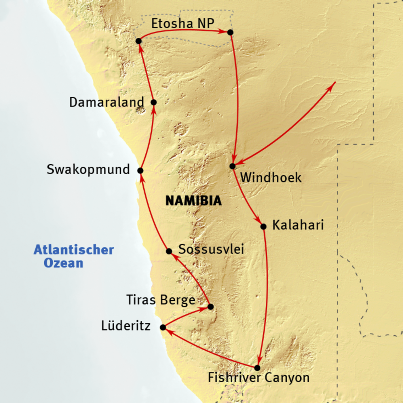 Kalahari-Wüste - Fish River-Canyon - Lüderitzbucht - Namib-Wüste - Swakopmund - Damaraland - Etosha-Nationalpark - Waterberg - Okapuka - Windhoek