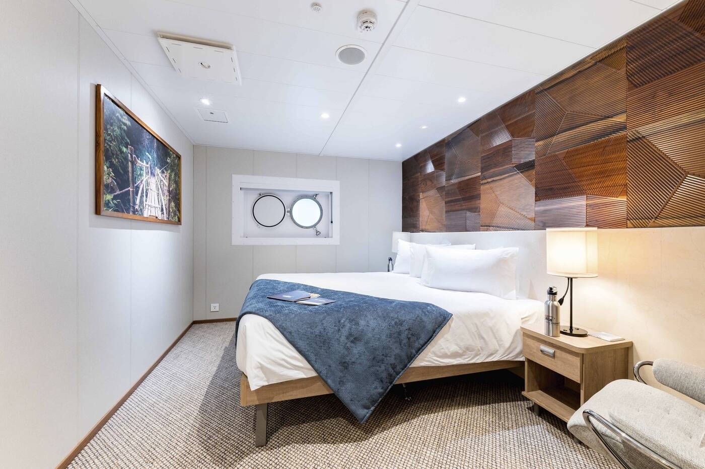 - Kat. A = Coral Deck Stateroom, Zweibettkabine | Deck 2 | ca. 17 m² // Doppelbett (kann separiert werden), Bullauge, Dusche/WC, Stuhl, ausreichend Stauraum