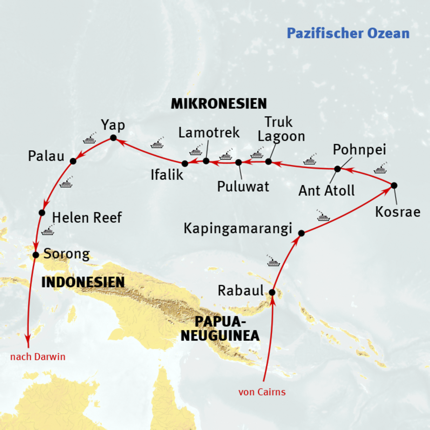 Cairns - Rabaul - Kapingamarangi - Kosrae - Pohnpei - Ant Atoll - Truk Lagoon - Poluwat - Lamotrek - Ifalik - Yap Island - Palau - Helen Reef - Sorong - Darwin